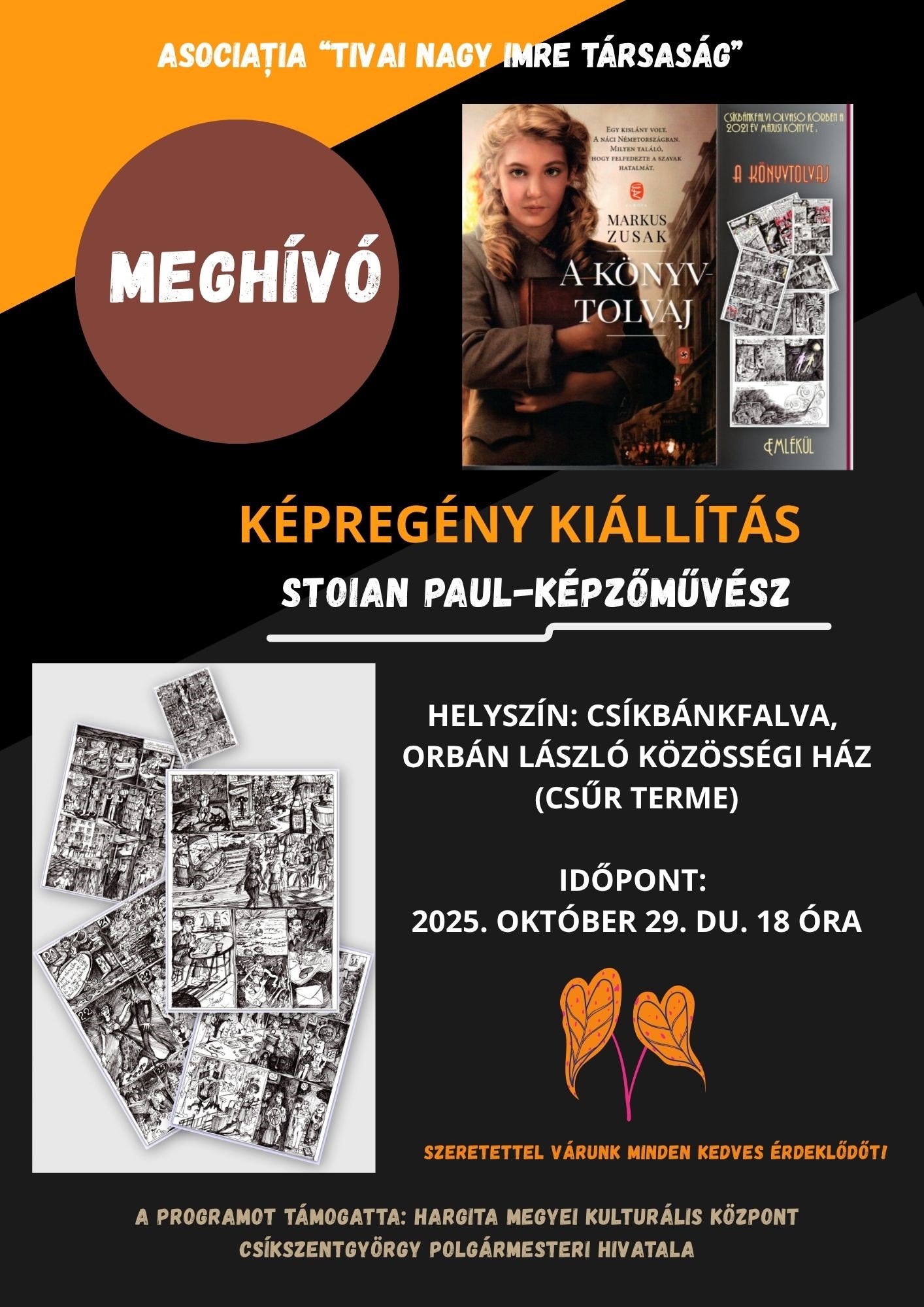 A csíkszentmártoni Tivai Nagy Imre Társaság vezetősége képregény-kiállítást szervez Stoian Paul amatőr képzőművész alkotásaiból szerdán 18 órától Csíkbánkfalván, az Orbán László Közösségi Ház Csűr termében. A képregények a Tivai olvasókörben olvasott szépirodalmi művek hatására jöttek létre, ahol az alkotó, olvasóköri tagként olvasta és rajzolta le az adott műveket.