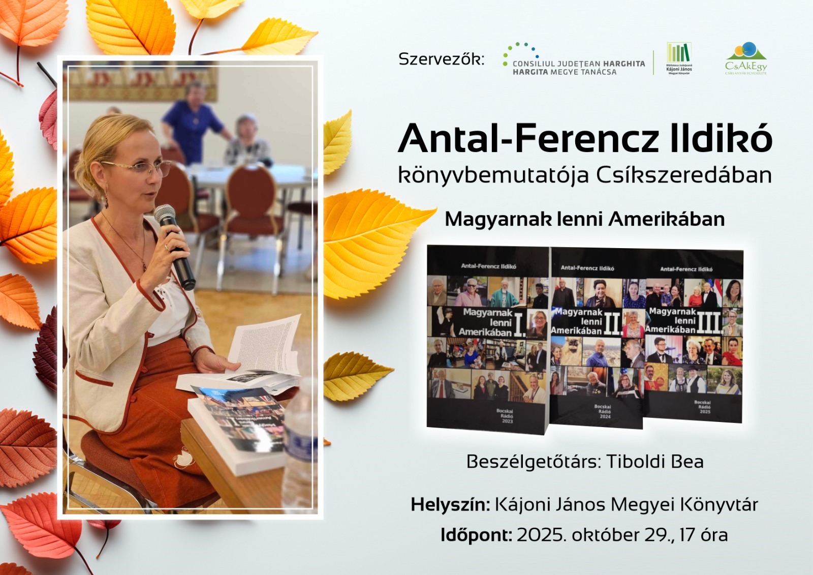 Antal-Ferencz Ildikó Magyarnak lenni Amerikában című könyvét mutatják be szerdán 17 órától a csíkszeredai Kájoni János Megyei Könyvtárban. A szerző erdélyi születésű, nagycsaládos édesanya, szabadúszó újságíró, blogger, aki nemrég települt haza Amerikából Budapestre. Családjával három évet éltek New Jersey államban, ahol a helyi magyar közösségek tagjává váltak. Az észak-amerikai diaszpórában töltött idő alatt több mint kétszáz cikket, köztük 120 interjút készített a nyelvük, kultúrájuk, hagyományaik és a helyi közösségeik iránt elkötelezett észak-amerikai magyarokról, amelyek magyarországi újságokban jelentek meg. Ezen interjúkat tartalmazza a Magyarnak lenni Amerikában háromrészes könyvsorozat. A szerzővel Tiboldi Bea beszélget.