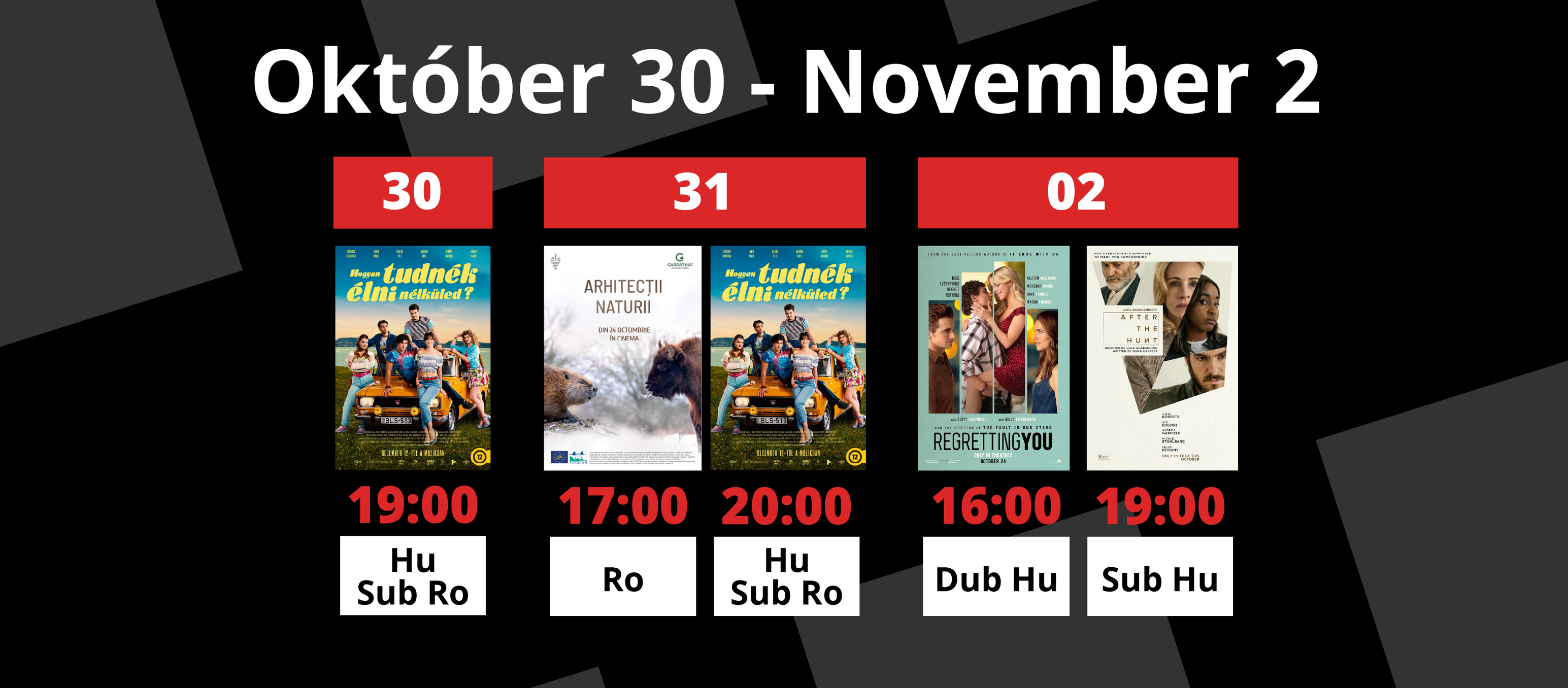 Csütörtökön 19 órától vetítik a Hogyan tudnék élni nélküled? című zenés vígjátékot magyar (eredeti) nyelven, román felirattal. Pénteken 17-től az Arhitecții naturii című román dokumentumfilm lesz látható eredeti nyelven, 20 órától pedig ismét látható lesz a Hogyan tudnék élni nélküled? Vasárnap 11-től vakációs családi matinét szerveznek, vagyis egy „meglepetés film” lesz látható, amelyre az egységes kedvezményes jegyár a család minden tagjának 10 lej. 16 órától az Elrontott életek című drámát vetítik magyar szinkronnal, majd a vetítések sorát a 19 órától kezdődő Vadászat után című thriller zárja angol (eredeti) nyelven, magyar felirattal. A vetítésekre jegyek válthatók a bilete.ro honlapon.