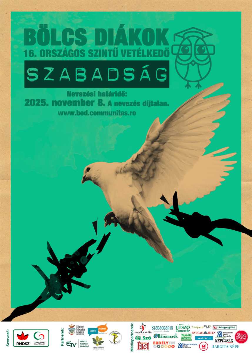 A Communitas Alapítvány és a Kolozsvári Református Kollégium a Babeș-Bolyai Tudományegyetemmel partnerségben idén is megszervezi a Bölcs Diákok országos szintű vetélkedőt. A tavaly elkezdett sorozat témája a Szabadság, annak keresésének és megtalálásának általános lehetőségeit és egyéni megéléseit tanulmányozzák különböző történelmi korok keretei között. A verseny célja a diákokkal megismertetni ezen történelmi korszakok sajátosságait interaktív, szórakoztató feladatok segítségével. Szeretnék ráébreszteni a fiatalokat arra, hogy ezen ismeretek és tudás birtokában felelősséget vállalhatnak a társadalom formálásában. A vetélkedőre 3-4 fős középiskolás csapatok jelentkezését várják egy vezetőtanár kíséretével, jelentkezni november 8-ig (szombat) lehet a www.bod.communitas.ro honlapon.