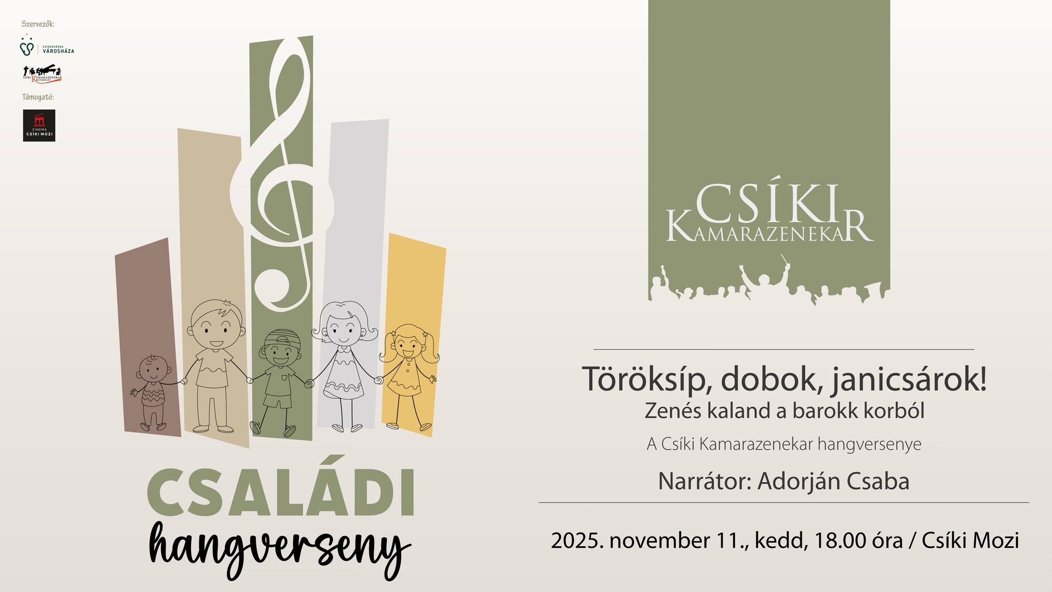 Töröksíp, dobok, janicsárok! – Zenés kaland a barokk korból címmel ad családi hangversenyt a Csíki Kamarazenekar kedden 18 órától a Csíki Moziban. A vidám, interaktív koncerten az előadók és nézők együtt fedezhetik fel, hogyan szólal meg egy barokk korabeli csata, és milyen hangszerekkel keltik életre a zeneszerzők a különböző harci zajokat, a történeten Adorján Csaba vezet végig. A teljes árú jegy 20 lejbe, a kedvezményes jegy 10 lejbe kerül, amelyeket a Csíki Mozi jegypénztárában vagy az előadás előtt egy órával lehet megvásárolni.