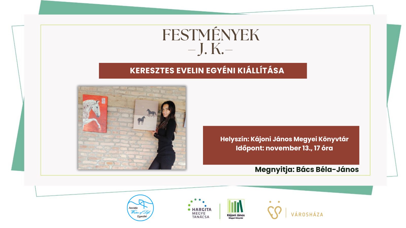 Keresztes Evelin csíkszeredai képzőművész egyéni festménykiállítását nyitják meg csütörtökön 17 órától a Kájoni János Megyei Könyvtárban. A művész – aki számára a festés a szépség és az öröm megosztása – olaj- és akrilképei finoman, mégis mélyen szólnak az életről: emberekről, állatokról, virágokról. A tárlatot Bács Béla-János nyitja meg.