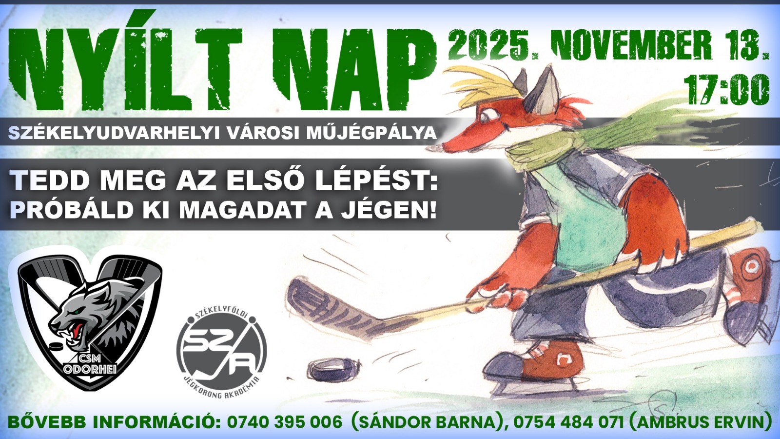 Nyílt napot szervez óvodás és kisiskolás gyermekek számára a Székelyudvarhelyi Farkasok csütörtökön 17 órától a városi műjégpályán. Az eseményen a gyermekek megismerhetik, hogy miből áll egy hokifelszerelés, és Furfanggal, a Székelyföldi Jégkorong Akadémia kabalájával is találkozhatnak. A résztvevőket arra kérik, hogy vigyenek magukkal korcsolyát, kesztyűt, sisakot és öltözzenek rétegesen. Nem szükséges előzetesen jelentkezni, további információ a 0740–395006 (Sándor Barna) vagy a 0754–484071 (Ambrus Ervin) telefonszámon kapható.