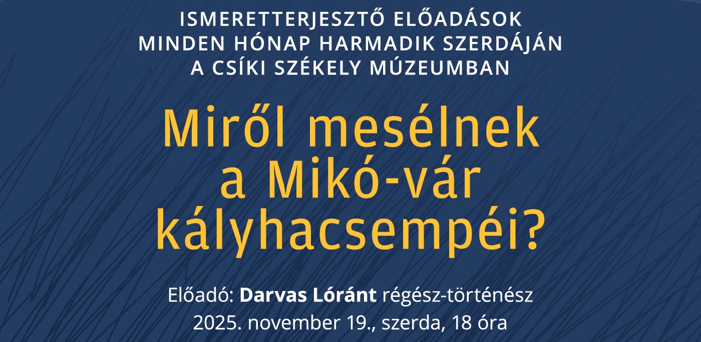 A Mikó-várban és közvetlen környezetében végzett régészeti kutatások során nagy mennyiségű kályhacsempe-töredék került felszínre, melyek az egykori várkastély fűtőberendezéseit díszítették. Szerdán 18 órától Darvas Lóránt régész Miről mesélnek a Mikó-vár kályhacsempéi? címmel tart előadást a Csíki Székely Múzeumban, ahol három csempetípus stilisztikai és morfológiai elemzésével próbálja meghatározni azok korát, illetve ezáltal a csempekályhákat megrendelő személy/személyek körét is leszűkíteni. A részvétel ingyenes.