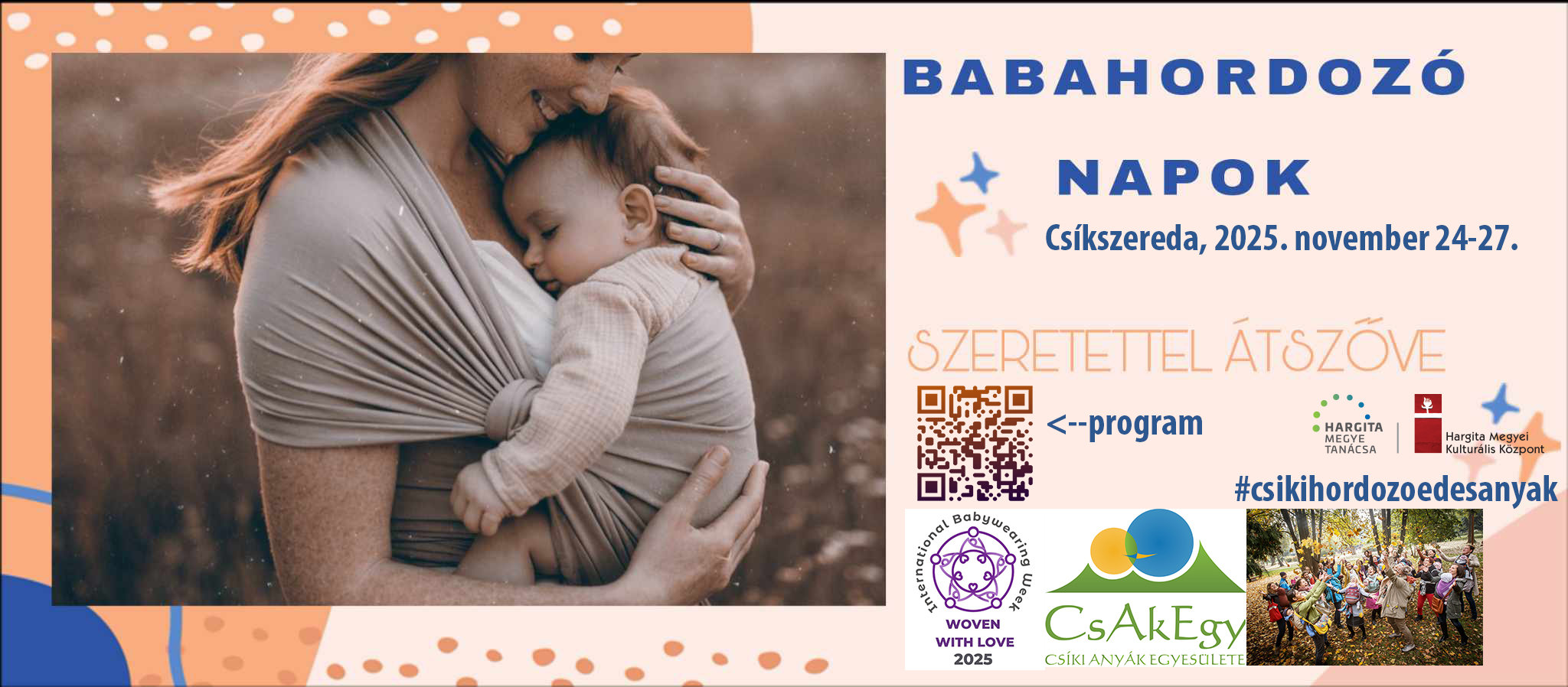 Idén is megszervezi a Csíki Anyák Egyesülete a Babahordozó Napokat Csíkszeredában, amely tartalmas együttlétre, kikapcsolódásra és hasznos tanulásra ad lehetőséget. A program már hétfőn elkezdődött, de kedden és szerdán is be lehet csatlakozni. Kedden 10 órától Csukás Emese babahordozási tanácsadó tart előadást Hátonhordozós praktikák címmel, 11.30-tól hordozós sétát szerveznek. 17-től Benkő Boglárka biomérnök, kutató, tudatoséletmód-tanácsadó Egészségtudatos háztartás a gyakorlatban, majd 18-tól Molnár Annamária klinikai pszichológus, korafejlesztő szakember „KARBAN tartott idegrendszer” – a hordozás jótékony hatása a fejlődésre címmel tart előadást. Az előadásokat a Hargita Megyei Kulturális Központban (Mihai Eminescu utca 3A. szám) tartják. A helyszínen a programok ideje alatt több hordozóeszköz is kipróbálható ingyenesen.