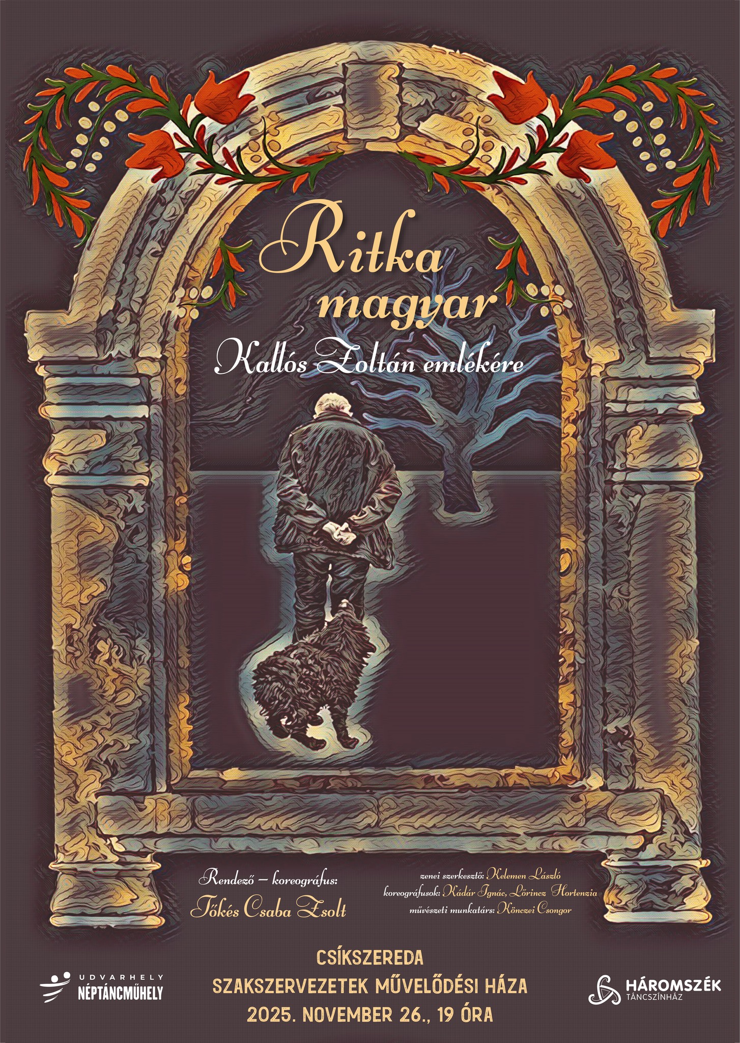 A csíkszeredai Művészetek Házában mutatja be Ritka magyar – Kallós Zoltán emlékére (rendező-koreográfus: Tőkés Csaba Zsolt) című előadását az Udvarhely Táncműhely és a Háromszék Táncszínház szerdán 19 órától. A teljes árú belépő 30 lej, a kedvezményes (diákok és nyugdíjasok számára) 15 lej, elővételben megvásárolható a Művészetek Háza jegypénztárában (szerdán 10–14 óra között). További információ: 0266–311295.