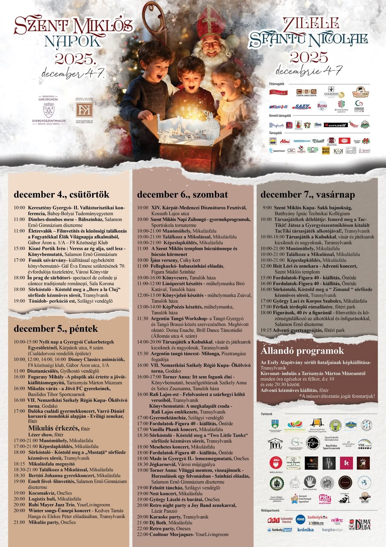 Vasárnapig zajlik a Szent Miklós Napok Gyergyószentmiklóson. Könyvbemutatókkal, kiállításokkal, szakmai konferenciákkal, koncertekkel, kézműves-foglalkozásokkal, Mikulás-futással, adventi kézművesvásárral, filmvetítéssel és sok más érdekességgel várják az érdeklődőket, az esemény sztárvendége pedig a Mikulás lesz. A részletes program elérhető a Szent Miklós Napok Facebook-oldalon.