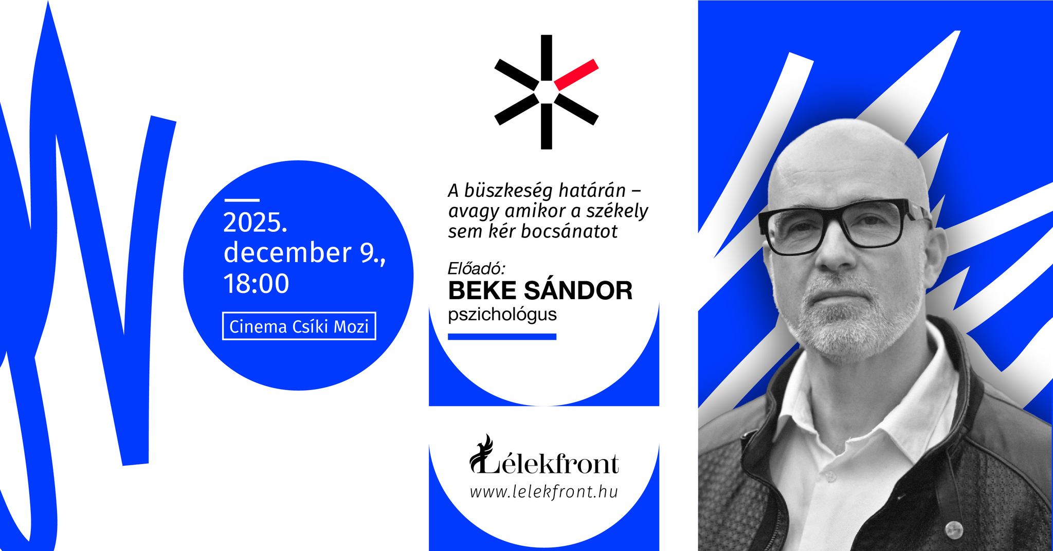 A büszkeség határán – avagy amikor a székely sem kér bocsánatot címmel tart előadást Beke Sándor emberi viselkedési mintákkal, kapcsolati dinamikákkal és a lelki határok témájával foglalkozó szakértő kedden 19 órától a Csíki Moziban. Az esemény ismertetője szerint a hétköznapokban a „nárcizmus” jelzőt sokan használják, gyakran csak önzést vagy feltűnési vágyat értve alatta. Kevésbé ismert, hogy a valódi nárcisztikus minták jóval összetettebbek – és sokak életére gyakorolnak romboló hatást. A csíkszeredai előadás közérthető, tapasztalatalapú lesz, és gyakorlati útmutatást ad azoknak, akik szeretnék jobban megérteni a nárcizmus jelenségét – és a saját védelmüket. A belépő ára 40 lej, elővételben megvásárolható a bilete.ro honlapon és a Csíki Mozi jegypénztárában.