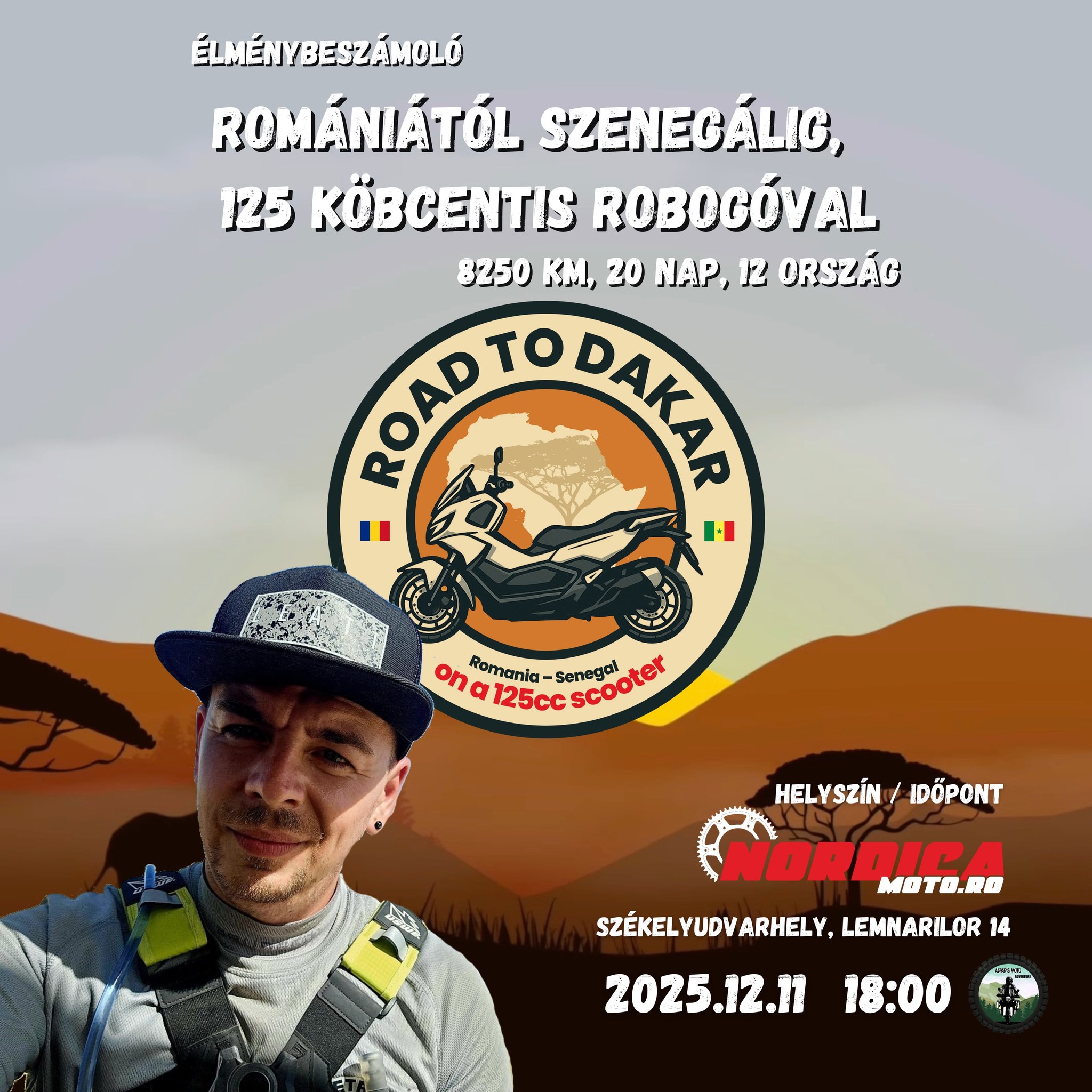 20 nap, 12 ország, 8250 km – és mindezt 125 cm³-es robogóval! A székelyudvarhelyi Mihály Alpár egy igazán különleges kalandba vágott bele: elindult Szenegálig és csütörtökön 18 órától első ízben tart beszámolót és közönségtalálkozót, ahol mesél az útról, élményeiről és a nehézségekről. Az eseményt a NordicaMoto üzletében szervezik meg (Fások utca 14. szám), a belépés ingyenes, de regisztrációhoz kötött, ez megtehető az esemény közösségi oldalán levő űrlap kitöltésével.