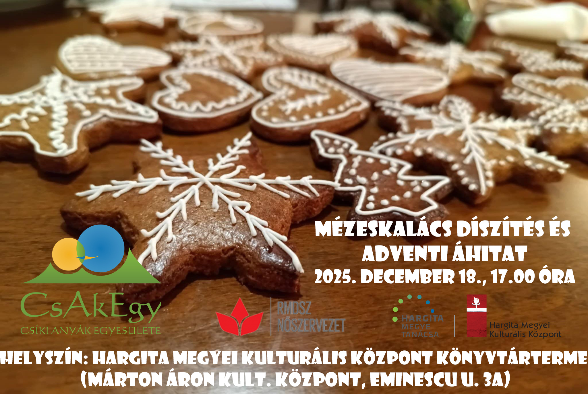 Mézeskalács-díszítésre és adventi áhítatra hívnak csütörtökön 17 órától Csíkszeredába, a Hargita Megyei Kulturális Központ könyvtártermébe. A szervezők készülnek díszíteni való mézeskaláccsal és díszítőelemekkel, de otthonról is lehet vinni alapanyagokat. Az eseményen Solymosi Alpár unitárius lelkipásztor tart rövid áhítatot, amit közös dalolás követ. Az est házigazdái Gábor Mónika és Kovács Karolina lesznek, a belépés ingyenes, szeretettel várnak minden érdeklődőt, akár egész családokat is. Szervezők: Csíki Anyák Egyesülete, Hargita Megyei Kulturális Központ, támogató: RMDSZ Nőszervezet.