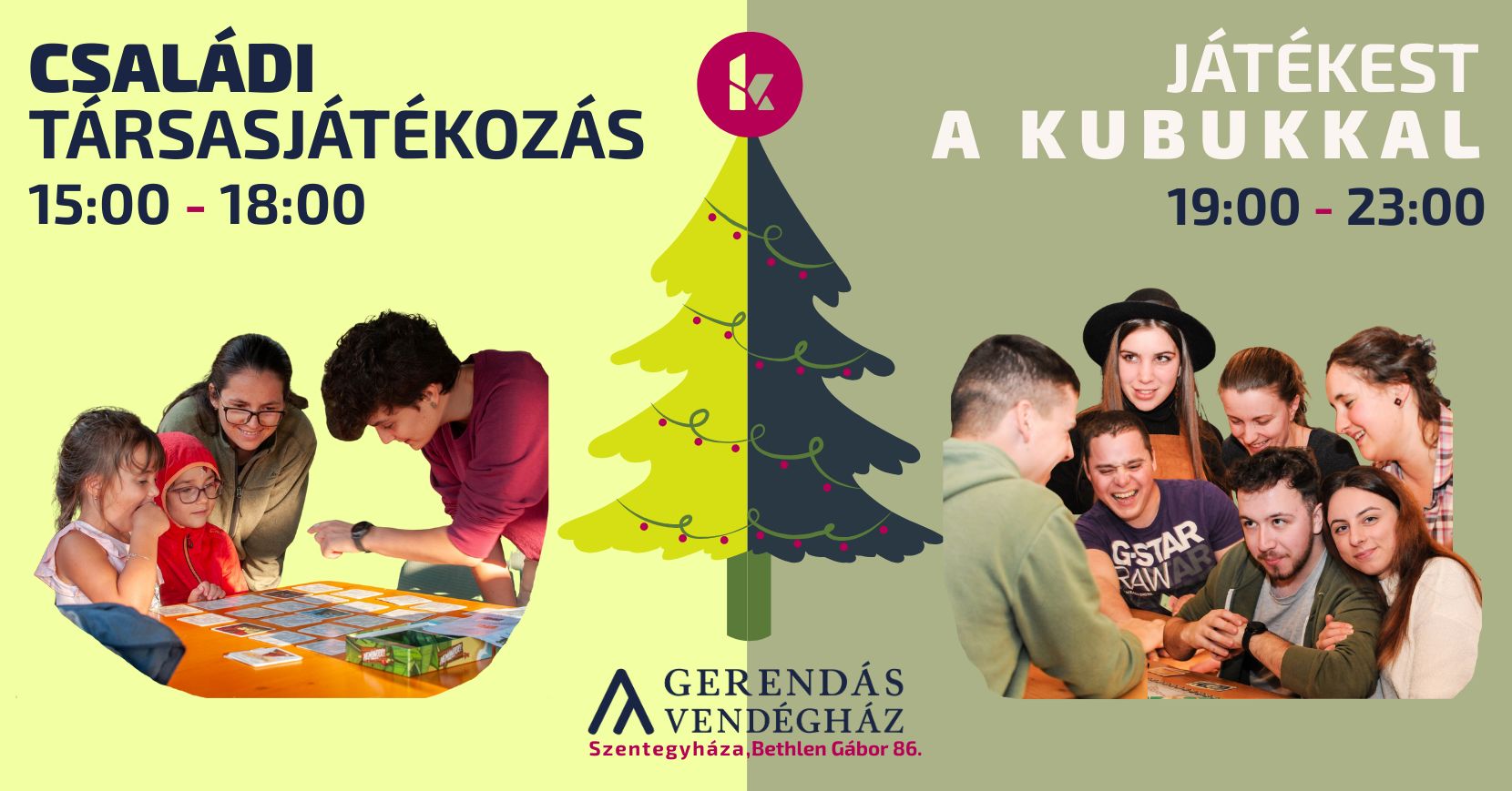 Karácsonyi társasjátékos napot szervez szombaton 15 órától Szentegyházán, a Gerendás Vendégházban a Kubuk. 15–18 óra között családi társasjátékozásra lesz lehetőség gyermekkel érkező családoknak, kezdőknek és könnyed játékélményre vágyóknak. A belépő ára 20 lej/fő, de családi kedvezmény is igénybe vehető: 2 fős család (szülő + gyerek): 15 + 15 lej, 3 fős család: 40 lej, 4 fős család: 50 lej, minden további családtag: +10 lej. 19 órától pedig játékest lesz a Kubukkal, amely főként felnőtteknek szól, erre a belépő ára 20 lej/fő. A részvételhez nem szükséges előzetes regisztráció, a helyszínen nassolnivaló is vásárolható.