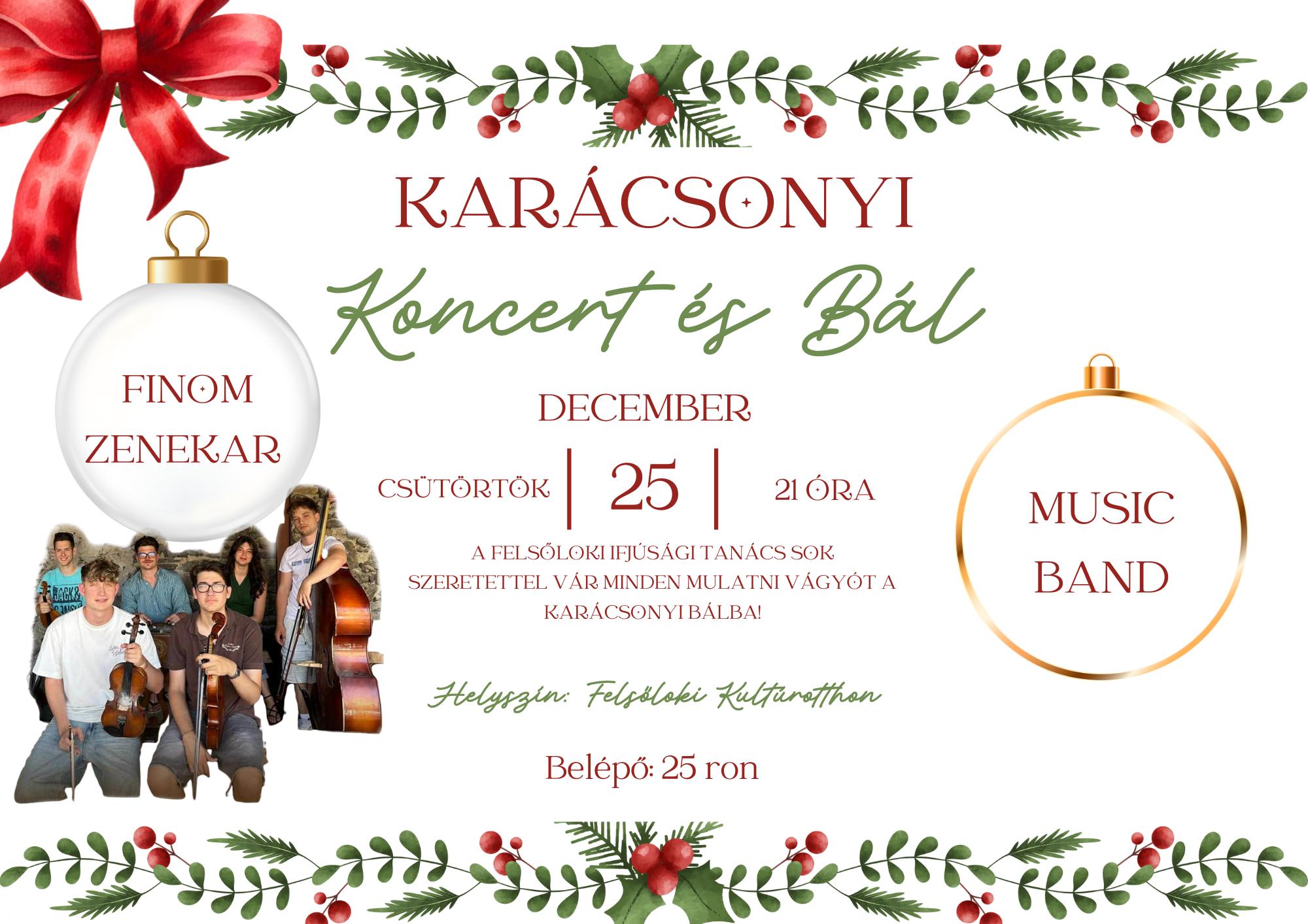 Meghitt, ünnepi hangulatú estét szervez a Felsőloki Ifjúsági Tanács csütörtökön 21 órától a gyimesfelsőloki kultúrotthonban. Az eseményen karácsonyi koncertet ad a kézdivásárhelyi Finom Zenekar (tagjai: Kovács Sára – ének, Bakó-Fazakas Vajk és Antal Adorján – hegedű, Fazekas Vince – brácsa, Áda Bálint – harmonika, cimbalom, Bakó-Fazakas Bátor – nagybőgő, kobza), amit hajnalig tartó mulatság követ, a hangulatról a MUSIC BAND gondoskodik. A belépő a koncertre és a bálba 25 lej, aki csak a bálba menne, 20 lejt kell fizessen.