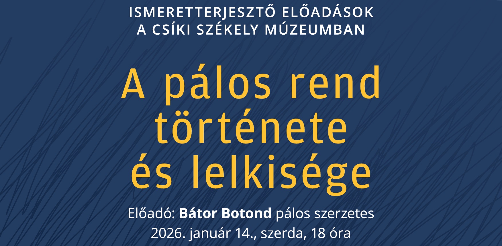 Az egyetlen magyar alapítású szerzetesrend történetét megismerve eljuthatunk az Isten által megalkotott emberségünk felfedezéséhez is. Erre a belső kalandra hívják az érdeklődőket: A pálos rend története és lelkisége címmel tart előadást Bátor Botond pálos szerzetes szerdán 18 órától a Csíki Székely Múzeumban. Az esemény a Csíki várórák előadás-sorozat részeként valósul meg, a belépés ingyenes.