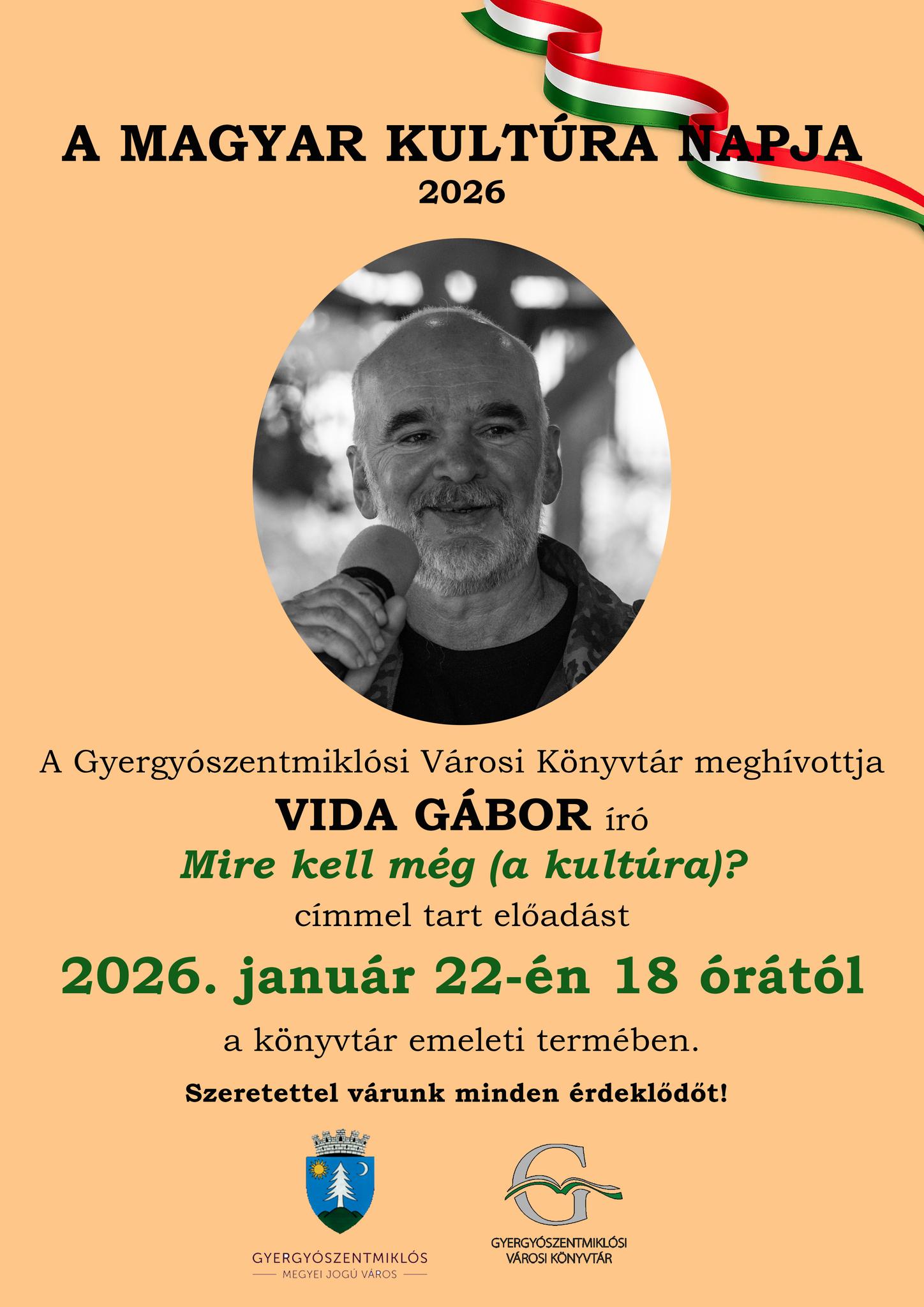 A magyar kultúra napja alkalmából Mire kell még (a kultúra)? címmel tart előadást Vida Gábor, számos irodalmi díjjal kitüntetett író, a LÁTÓ szépirodalmi folyóirat főszerkesztője a Gyergyószentmiklósi Városi Könyvtárban csütörtökön 18 órától. Az előadáson a meghívott többek között arról fog beszélni, hogy a kultúra több, mint az, amire egy ország költségvetéséből sosem jut elég pénz, de arról is szó lesz, hogy egy kultúraellenes világban azok sincsenek meg a kultúra nélkül, akik ellene prédikálnak, csak ezt nem tudják.