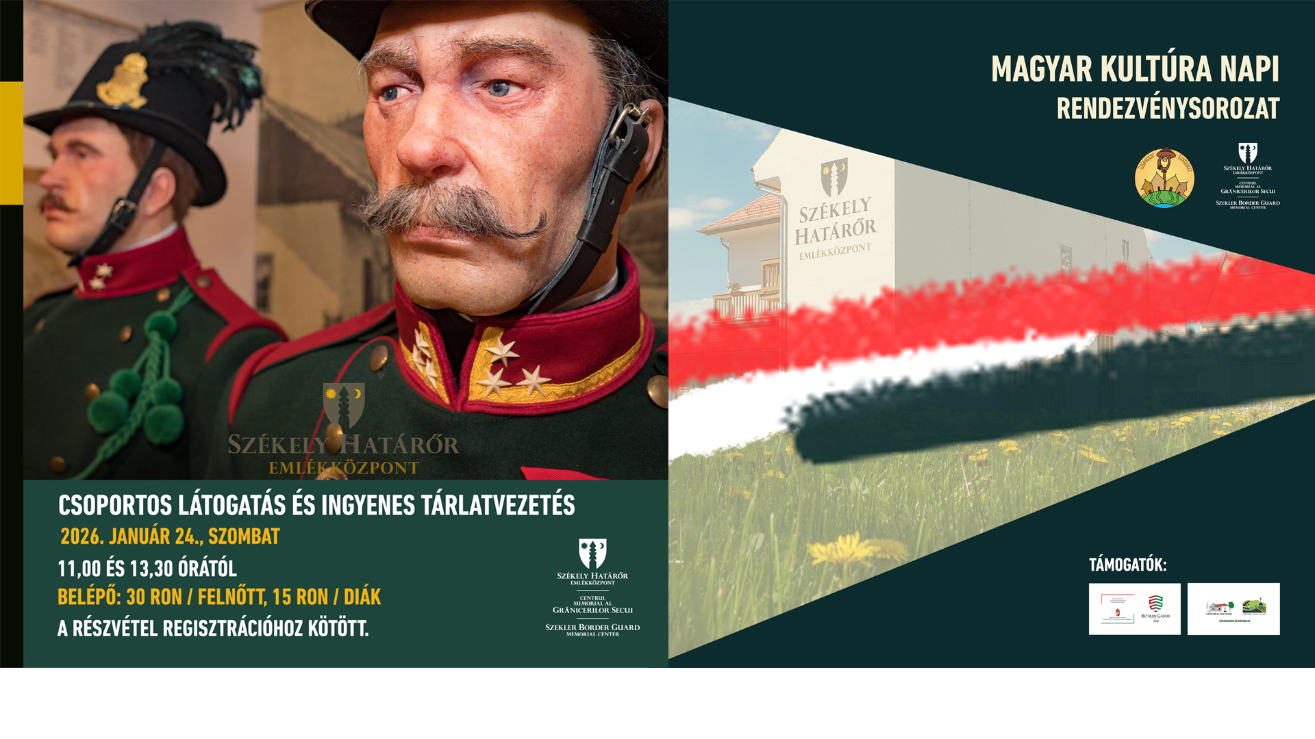 Idegenvezetéssel egybekötött csoportos látogatást szervez a szépvízi Székely Határőr Emlékközpont a székelység hadtörténetét bemutató kiállításán az intézmény munkaközössége szombaton 11-től és 13.30-tól. A belépőjegy felnőtteknek 30, diákoknak 15 lej, a mostani csoportos látogatás idegenvezetése díjmentes. A részvételhez regisztráció szükséges, ez megtehető az esemény közösségi oldalán levő űrlap kitöltésével ma 16 óráig. Az esemény a község magyar kultúra napi rendezvénysorozatának részeként valósul meg.