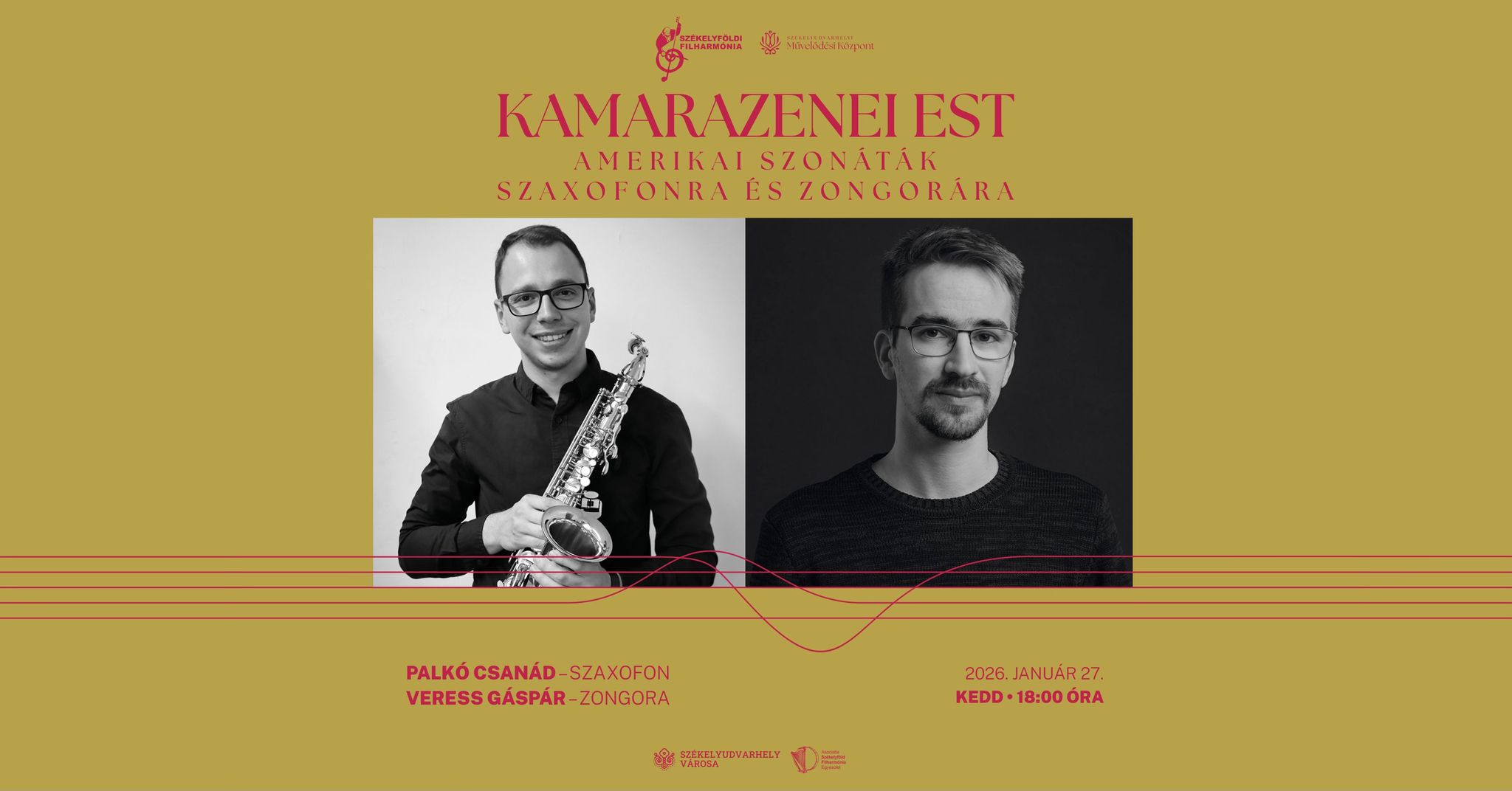 Kamarazenei estet ad Palkó Csanád (szaxofon) és Veress Gáspár (zongora) kedden 18 órától a székelyudvarhelyi polgármesteri hivatal Szent István termében. Az Amerikai szonáták szaxofonra és zongorára című koncertre érvényes a Balogh Ferenc kamarazenei bérlet, jegyeket a helyszínen, 17 órától lehet vásárolni. Jegyárak: felnőtteknek 40, nyugdíjasoknak 30, diákoknak 10 lej.
