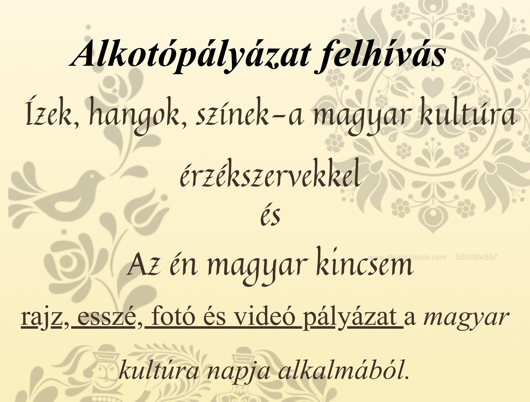 A magyar kultúra napja alkalmából alkotópályázatot hirdet a Szent Imre Népfőiskola Egyesület és a Henter-kúria, amellyel a magyar kultúra sokszínűségét szeretnék megmutatni az alkotásokon keresztül. A pályázat témája: „Ízek, hangok, színek – a magyar kultúra érzékszervekkel” (5–8. osztályosok: rajz, fotó, esszé, videó; 9–12. osztályosok: fotó, esszé, videó) és „Az én magyar kincsem” (rajz kategóriában 0–4. osztályosok). A téma szabadon értelmezhető, az alkotások lehetnek személyesek, gondolatébresztők, hagyományőrzők vagy kifejezetten modern megközelítésűek. Pályázati kategóriák: fotó, rajz/illusztráció, esszé, videó. A formai és terjedelmi követelmények és a leadási mód megtalálható a Szent Imre Népfőiskola közösségi oldalán, a pályamunkák leadási határideje február 10. éjfél. A legkiemelkedőbb alkotásokat díjazzák, valamint különdíjakat is kiosztanak a következő kategóriákban: legeredetibb alkotás, legszemélyesebb megközelítés és a közönség elismertjei.