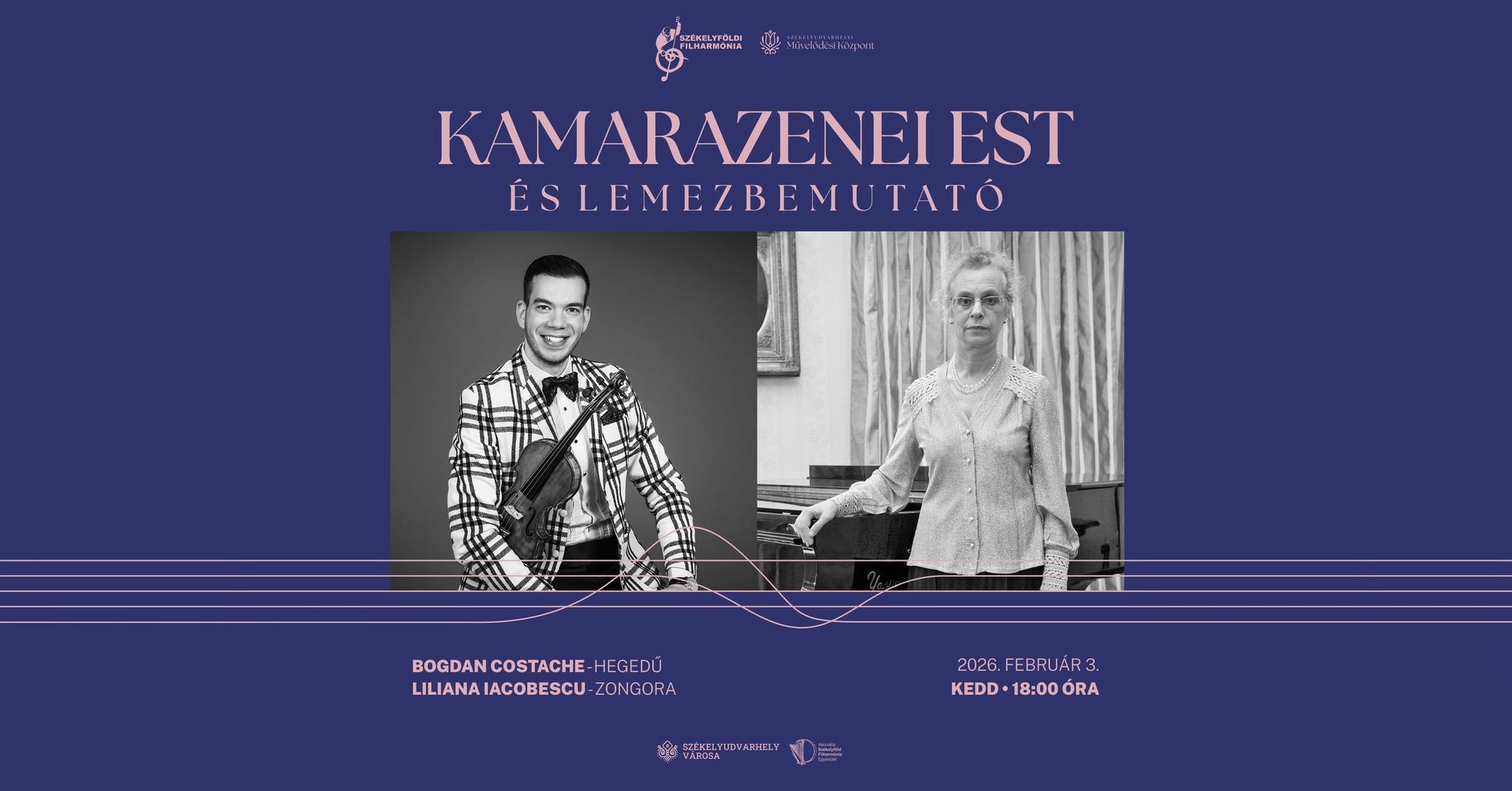 Kamarazenei estet és lemezbemutató koncertet szervez a Székelyföldi Filharmónia kedden 18 órától Székelyudvarhelyen, a városháza Szent István termében. Az eseményen Bogdan Costache játszik hegedűn és Liliana Iacobescu zongorán. A koncertre érvényes a Balogh Ferenc kamarazenei bérlet, jegyeket a helyszínen, 17 órától lehet vásárolni, a felnőtt- 40, a nyugdíjas- 30, a diákjegy 10 lejbe kerül.