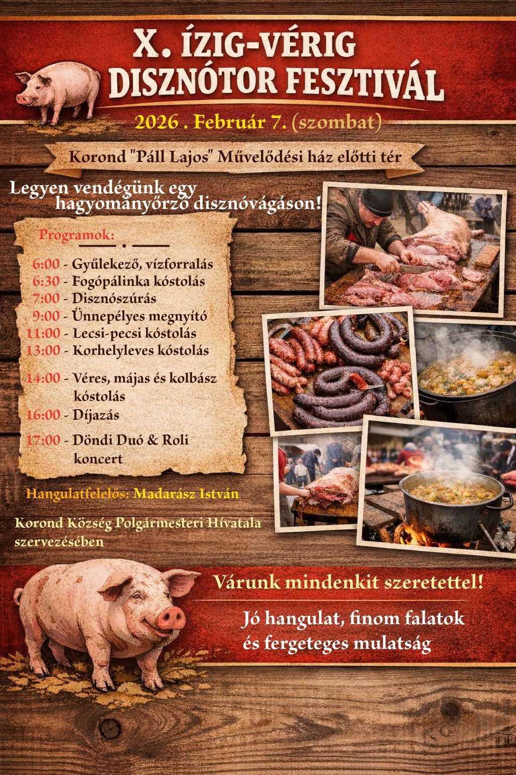 Tizedik alkalommal szervezik meg Korondon az Ízig-vérig Disznótor Fesztivált szombaton a Páll Lajos Művelődési Otthon előtti téren. A hagyományőrző esemény a disznótoros szokások, a közösségi összetartozás és a téli gasztronómia igazi ünnepe, ahol a nap során helyi és meghívott csapatok mutatják be a hagyományos disznótoros ételek elkészítését, miközben zene, jókedv és hamisítatlan téli hangulat tölti meg a teret. Szervező: Korond Község Polgármesteri Hivatala.