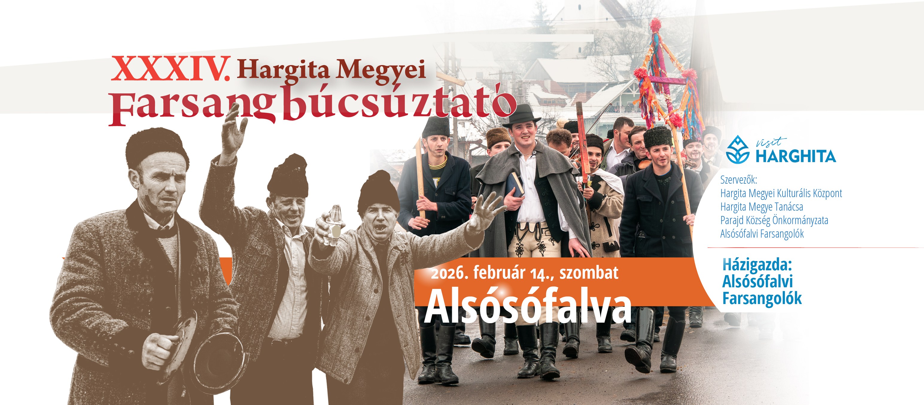 A XXXIV. Hargita Megyei Farsangbúcsúztató házigazdái idén az Alsósófalvi Farsangolók, így fergeteges hangulat, muzsikások, maskarások lakják be a település utcáit szombaton. A program szerint 10 órakor lesz a csoportok fogadása a faluközpontban, majd a megnyitó 11-től kezdődik, 11.30-kor indulnak a kijelölt útvonalakra, 14 órától pedig közös tánc és mulatság lesz a Kacsó András kultúrotthonban. Az eseményen részt vesznek Csíkborzsova, Csíkcsicsó, Csíkmenaság, Csíkszentdomokos, Csíkszentkirály, Csíkszentsimon, Csobotfalva, Gyergyóditró, Gyergyóremete, Gyergyószárhegy, Kászon és Szentegyháza hagyományőrző csoportjai. Szervezők: Hargita Megyei Kulturális Központ, Hargita Megye Tanácsa, Parajd Község Önkormányzata, Alsósófalvi Farsangolók.