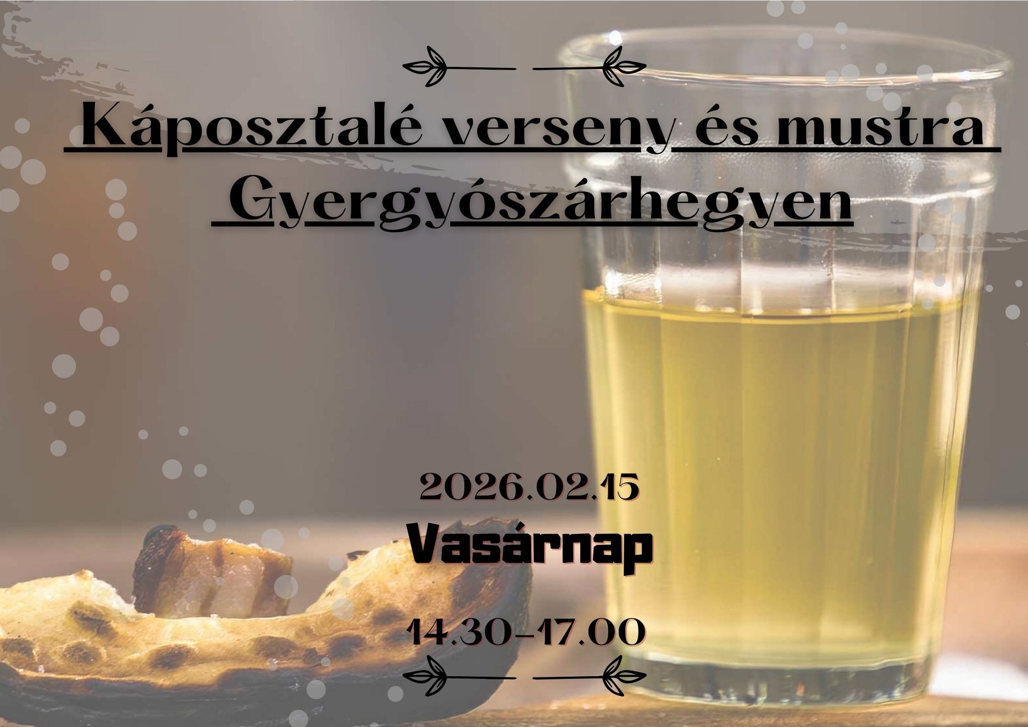 Keresik az idei év legízletesebb, legzamatosabb, legfinomabb savanyúkáposzta-levét, ezért káposztaléversenyt és -mustrát tartanak Gyergyószárhegyen vasárnap 14.30-tól. A szervezők arra biztatnak mindenkit, hogy vigyen fél liter káposztalevet átlátszó, tiszta üvegben vasárnap 14.30 és 15 óra között a Káposzta Házba, és a zsűri értékeli majd 17 órától a kultúrházban. Az enni- és innivaló garantált, a jókedvről zenészek gondoskodnak. Szervezők: Káposzta Termelők Egyesülete, Civilis Egyesület, Gyergyószárhegyi Kultúrház.