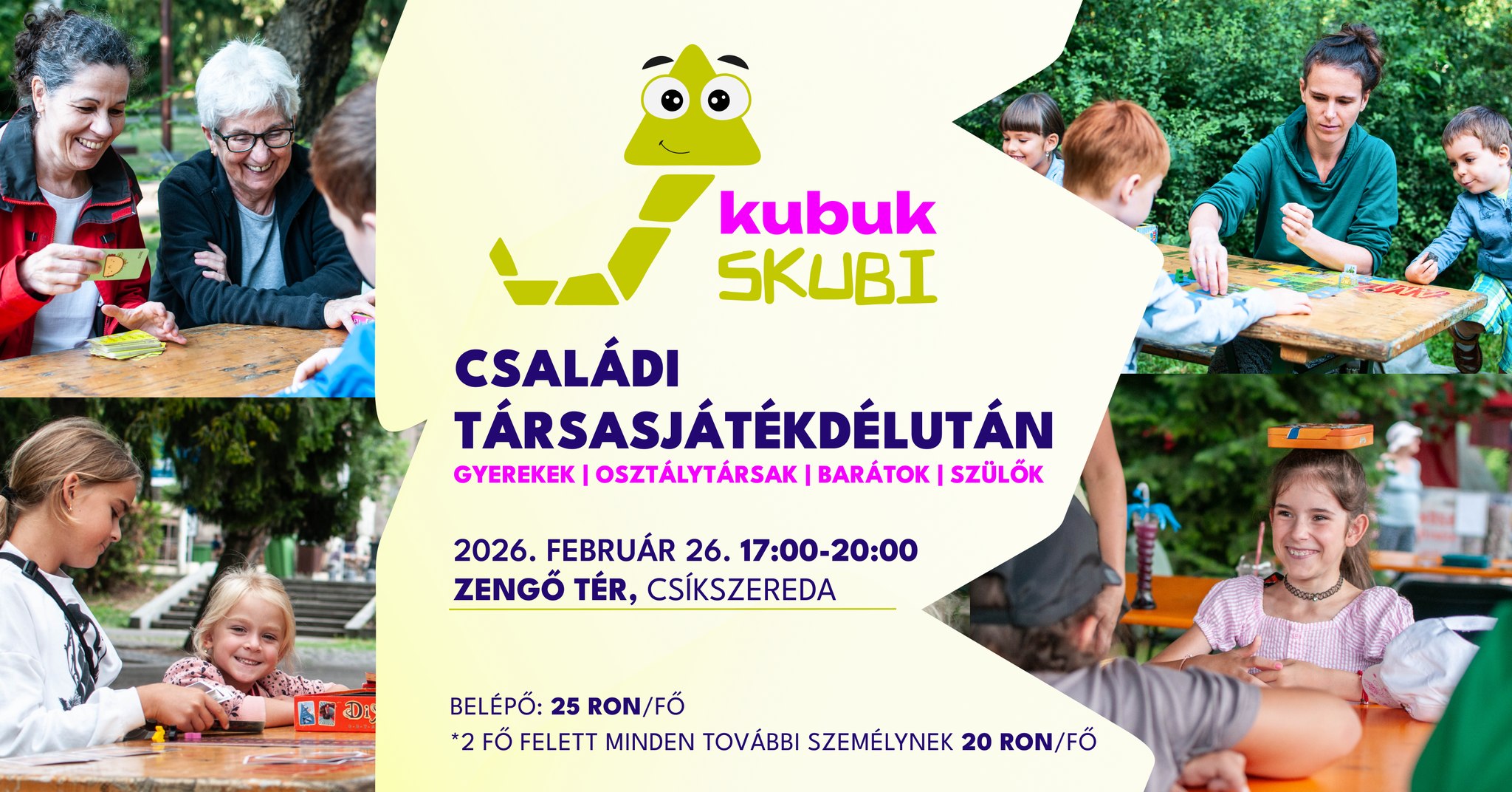 Családi társasjátékozásra hív a Kubuk csapata csütörtökön 17 órától a csíkszeredai Zengő Térbe. A belépő ára 25 lej/fő, két fő felett minden további személynek 20 lej/fő, részvételi díjat a helyszínen lehet fizetni. Gyermekek csak kísérővel vehetnek részt az eseményen, az alsó korhatár 5 év. A részvételhez előzetes regisztráció szükséges, ez megtehető az esemény közösségi oldalán levő űrlap kitöltésével.