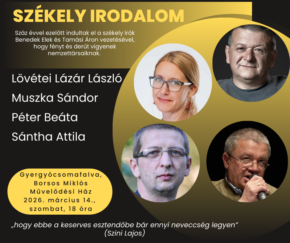 Száz évvel ezelőtt indultak el a székely írók Benedek Elek és Tamási Áron vezetésével, hogy fényt és derűt vigyenek nemzettársaiknak. Ma egy másik csoport teszi ugyanazt. Székely irodalom címmel szerveznek irodalmi estet a gyergyócsomafalvi Borsos Miklós Művelődési Házban szombaton 18 órától, amelyen jelen lesz Lövétei Lázár László (Magyarország Babérkoszorúja díjas költő, a Feketemunka szerzője), Muszka Sándor (József Attila-díjas író, költő, a Sanyi bá szerzője), Péter Beáta (író, drámaíró, a Búcsújárás szerzője) és Sántha Attila (Magyarország Babérkoszorúja díjas költő, a Bühnagy székely szótár szerzője).