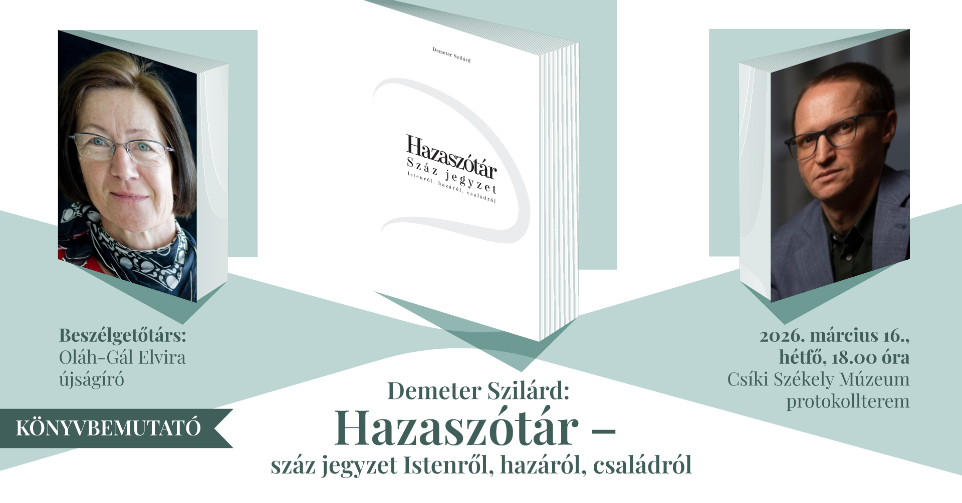 Hétfőn 18 órától a Csíki Székely Múzeum protokolltermében mutatják be Demeter Szilárd Hazaszótár című kötetét. Az ismertető szerint a Hazaszótár száz jegyzet Istenről, hazáról, családról, annak a szótára, amit nem lehet kikeresni sehol máshol: mit jelent a haza, ha a traktorról nézed, mit jelent az anyanyelv, ha elveszítheted, mit jelent a teremtés rendje, ha épp rombolják. A szerzővel Oláh-Gál Elvira újságíró beszélget.