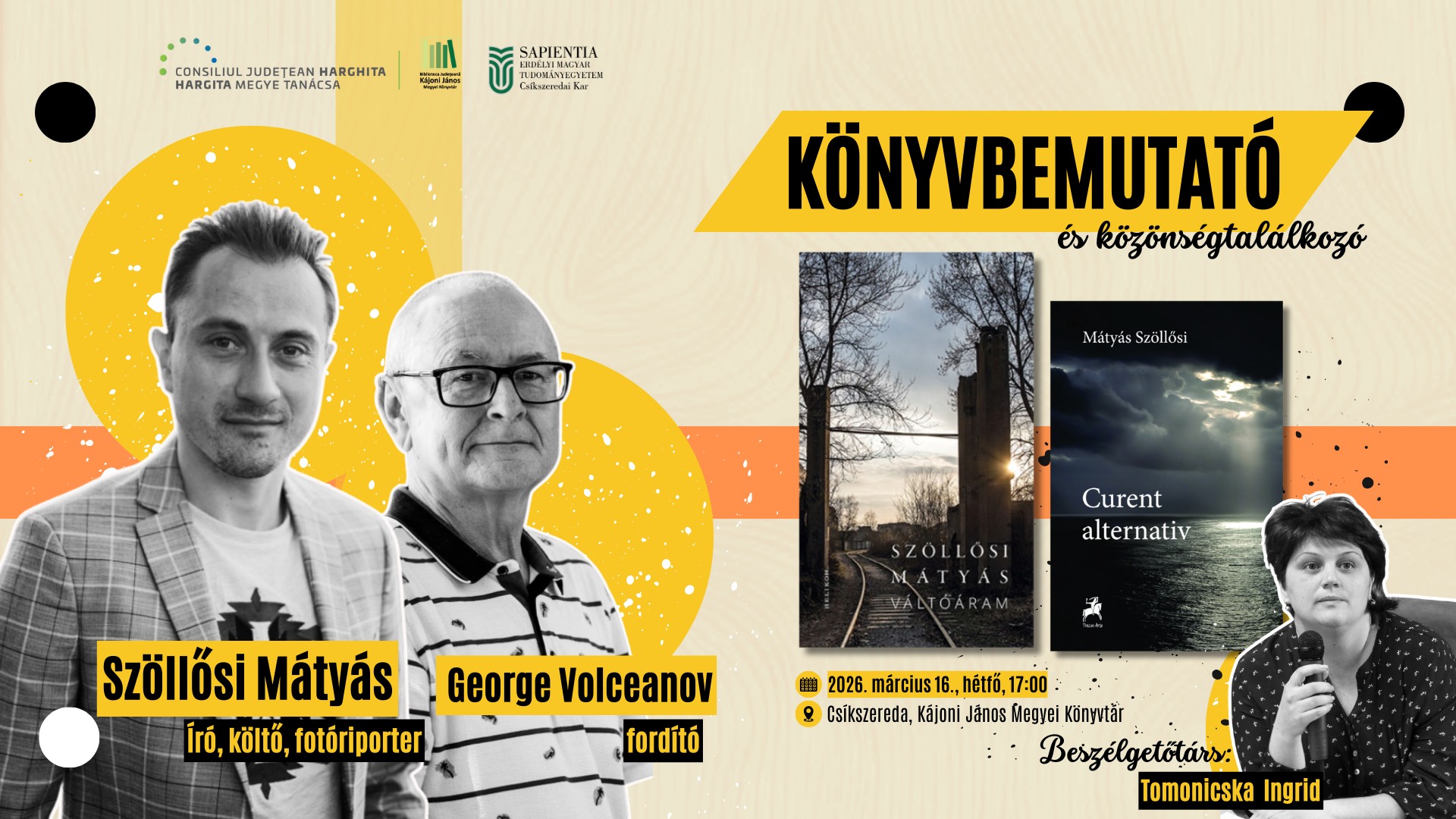 Szöllősi Mátyás író, költő, fotóriporter Váltóáram című novelláskötetét és annak román nyelvű fordítását mutatják be hétfőn 17 órától Csíkszeredában, a Kájoni János Megyei Könyvtárban. Az elbeszéléskötet 2017-ben elnyerte a legjobb első prózakötetnek járó Margó-díjat, és azóta román és szerb fordításban is megjelent. Az eseményen jelen lesz Szöllősi Mátyás és George Volceanov román műfordító, anglista, lexikográfus és egyetemi tanár, a kötet fordítója is, akikkel dr. Tomonicska Ingrid, a Sapientia – EMTE Csíkszeredai Karának egyetemi adjunktusa beszélget.