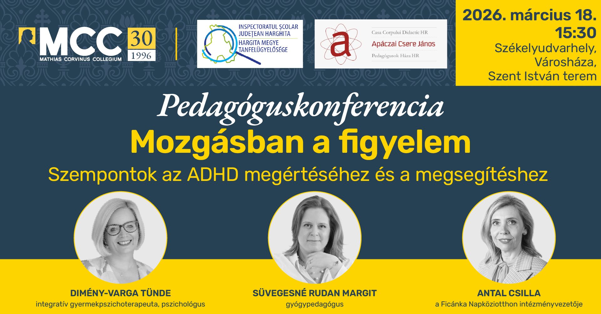 Mozgásban a figyelem címmel szervez pedagóguskonferenciát a székelyudvarhelyi városháza Szent István termében szerdán a Mathias Corvinus Collegium (MCC), a Hargita Megyei Tanfelügyelőség és a Pedagógusok Háza munkaközössége. A rendezvény célja az oktatás új útjainak közös felfedezése, a támogató pedagógusi attitűd megerősítése és a módszertani inspiráció. A konferencia találkozási pont, közösségi fórum kíván lenni, miközben az MCC képzésrendszerébe is betekintést kínál. A regisztráció 15.30-kor kezdődik, 16-tól köszöntések lesznek, 16.20-tól Süvegesné Rudan Margit gyógypedagógus tart előadást Szempontok az ADHD megértéséhez és a megsegítéshez címmel, majd 18 órától kerekasztal-beszélgetés következik ADHD a tanteremben címmel, ennek résztvevői Süvegesné Rudan Margit, dr. Antal Csilla, a Ficánka Napközi Otthon intézményvezetője és Dimény-Varga Tünde integratív gyermekpszichoterapeuta, pszichológus lesznek. Az esemény résztvevőinek igazolást biztosít a Mathias Corvinus Collegium Egyesület és a Hargita Megyei Tanfelügyelőség. A részvétel online regisztrációhoz kötött, ez megtehető az esemény közösségi oldalán lévő űrlap kitöltésével.