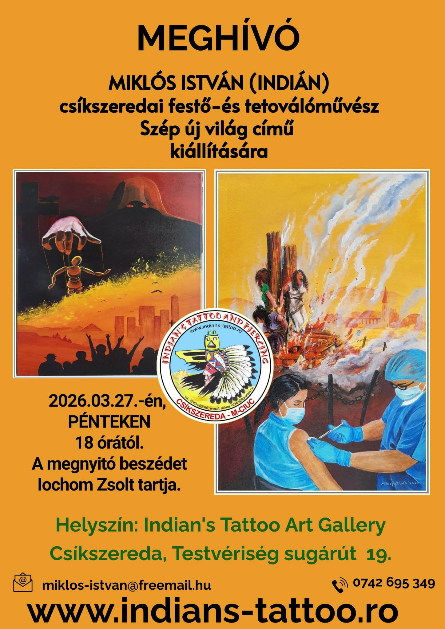 Miklós István (Indián) csíkszeredai festő- és tetoválóművész Szép új világ című kiállítását nyitják meg pénteken 18 órától az Indian’s Tattoo Art Galleryben (Testvériség sugárút 19. szám). A tárlat a művész világjárvány óta elkezdett aktuálpolitikai festményeit vonultatja fel. A megnyitóbeszédet Iochom Zsolt tartja.