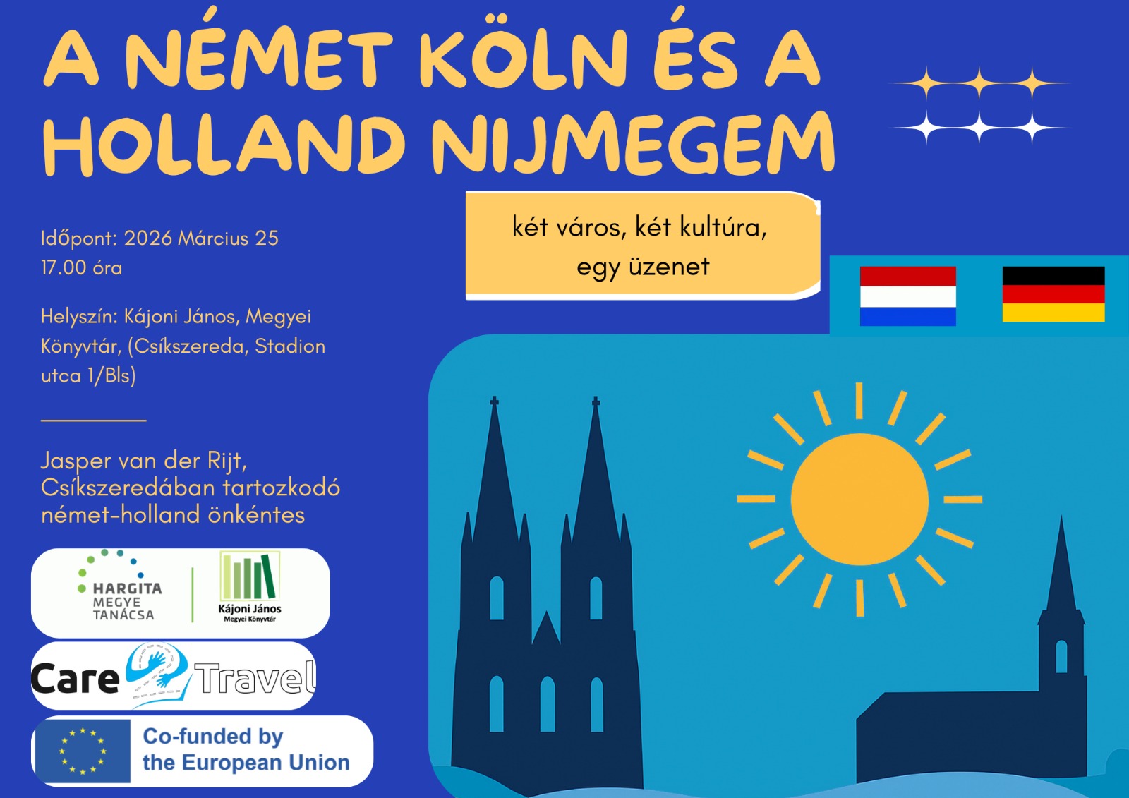 Interkulturális estet szervez a Care2Travel Egyesület és a Kájoni János Megyei Könyvtár szerdán 17 órától a könyvtárban. A Két város, két kultúra… és egy közös történet! című előadáson az érdeklődők közösen fedezhetik fel, mi történik, ha egy német és egy holland város, Köln és Nijmegen „találkozik” egy estén. Az eseményen Jasper van der Rijt német–holland gyökerekkel rendelkező önkéntes személyes történetein keresztül kalauzol el két különleges város világába, és bemutatja, milyen érzés két kultúra között élni – vagy éppen mindkettőhöz tartozni.