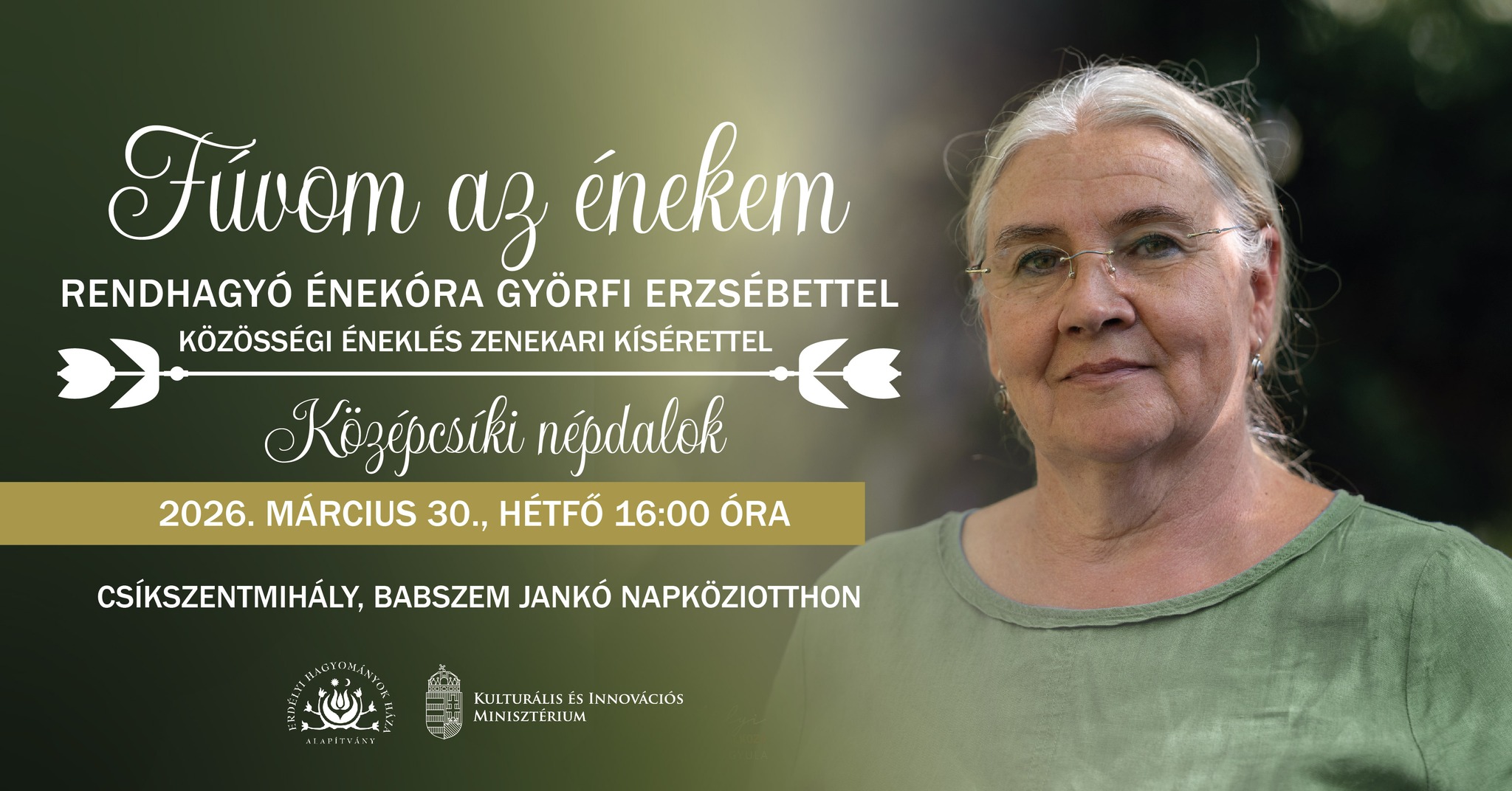 Fúvom az énekem címmel szervez rendhagyó énekórát zenekari kísérettel a csíkszentmihályi Babszem Jankó Napközi Otthonban hétfőn 16 órától az Erdélyi Hagyományok Háza Alapítvány csíkszeredai területi irodája. Az eseményen Györfi Erzsébettől tanulhatnak középcsíki népdalokat az érdeklődők, a zenei kíséretet Antal Csanád, Ferencz Dávid és Ferencz Vince adják.