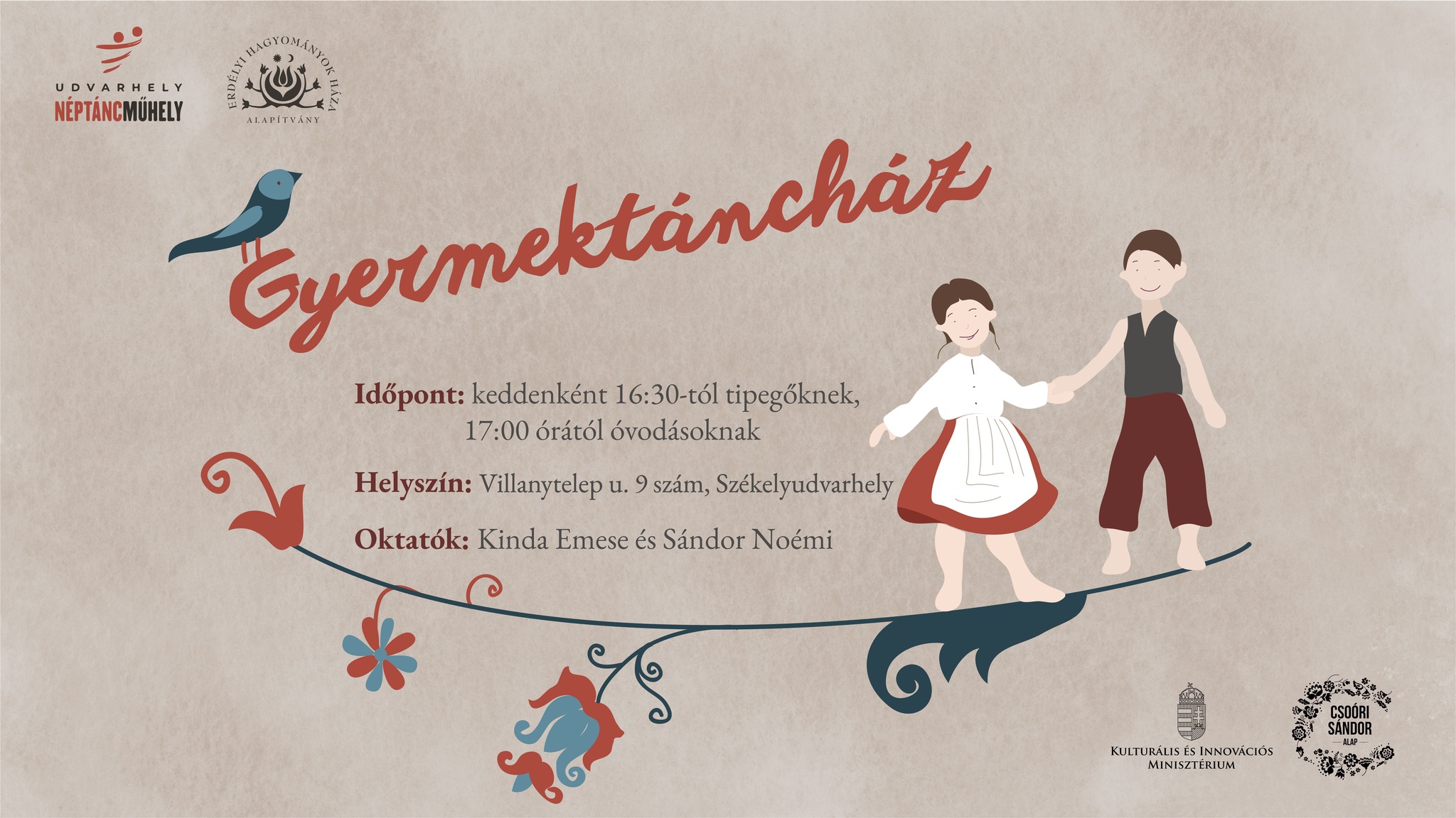A Kárpát-medence néptánckincseinek játékos megismerésére hív az Udvarhely Néptáncműhely csapata keddenként 16.30-tól tipegőket, 17 órától pedig óvodáskorú gyermekeket a Villanytelep utca 9. szám alá. Az oktatók Kinda Emese és Sándor Noémi, a résztvevőknek váltócipő használata kötelező.