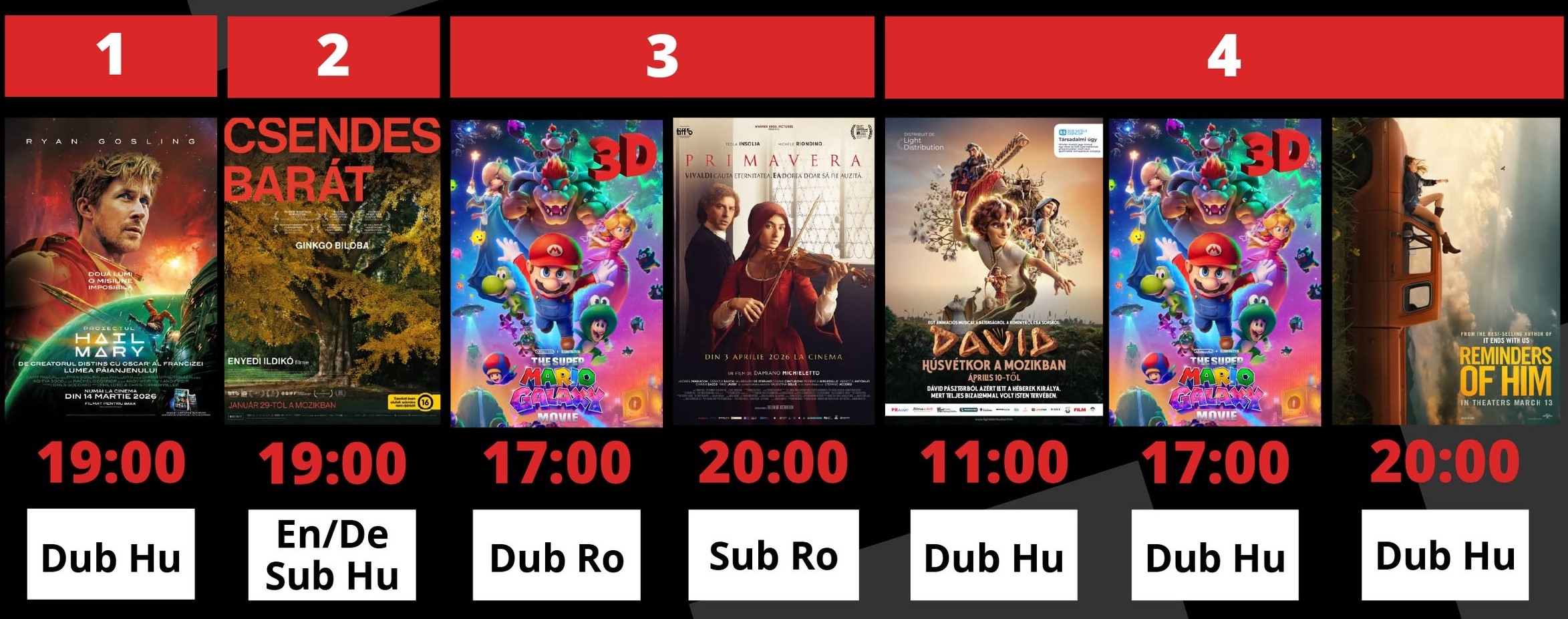 Szerdán 19 órától A Hail Mary-küldetés című sci-fit vetítik magyar szinkronnal, csütörtökön 19-től pedig a Csendes barát című dráma lesz látható angol és német (eredeti) nyelven, magyar felirattal. Pénteken 20 órától a Primavera című drámát tűzik műsorra olasz (eredeti) nyelven, román felirattal. Szombaton 11-től a Dávid című animációs film lesz látható magyar szinkronnal, 17-től a Super Mario Galaxis: A film animációt vetítik magyar szinkronnal, 20-tól pedig az Emlékek róla című drámát tekinthetjük meg magyar szinkronnal. A vetítésekre jegyek válthatók a prokult.ro honlapon. A képen látható pénteki 17 órai Super Mario Galaxis: A film vetítése elmarad.