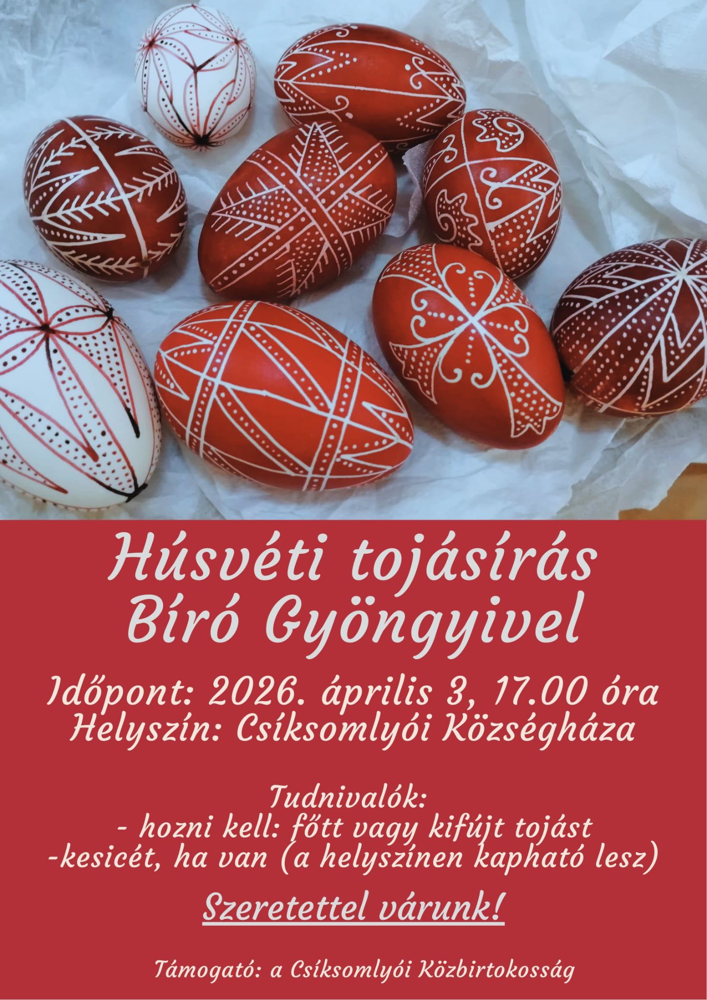 Húsvéti tojásíró kalákát szerveznek pénteken 17 órától a csíksomlyói községházán. A foglalkozást Bíró Gyöngyi hagyományőrző vezeti, a résztvevők kipróbálhatják a réztölcséres írókát, megismerkedhetnek a többszínű festéssel, a maratással és a különböző minták jelentésével. Az érdeklődőket arra kérik, hogy vigyenek magukkal főtt vagy kifújt tojást és kesicét, akinek van, de utóbbi a helyszínen is beszerezhető lesz.