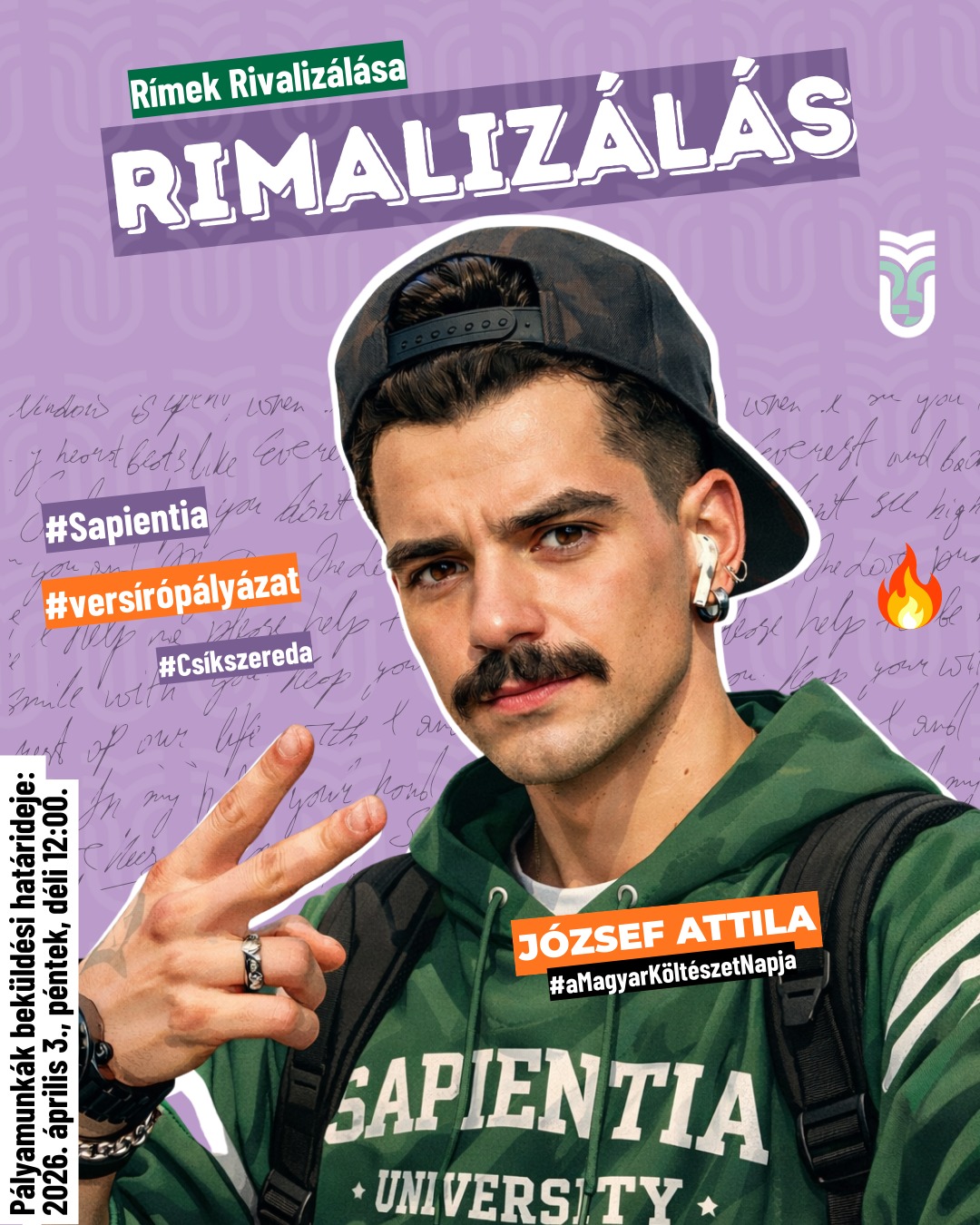 A költészet napja alkalmából versíró pályázatot hirdet RIMALIZÁLÁS címmel a Sapientia – EMTE Csíkszeredai Kara. A középiskolásoknak és egyetemistáknak kiírt versenyre magyar nyelvű alkotást lehet beküldeni, a két korosztályt külön kategóriában bírálják el. A szakmai zsűri mellett közönségdíjast is választanak az egyetem Facebook-oldalán zajló szavazással. A legjobbak könyvutalványokat és sapientiás ajándékokat nyernek, az ünnepélyes díjátadót pedig a Csíkszeredai Könyvvásáron tartják. A pályamunkák beküldési határideje péntek déli 12 óra, a jelentkezési űrlap az egyetem weboldalán és közösségi felületein érhető el.