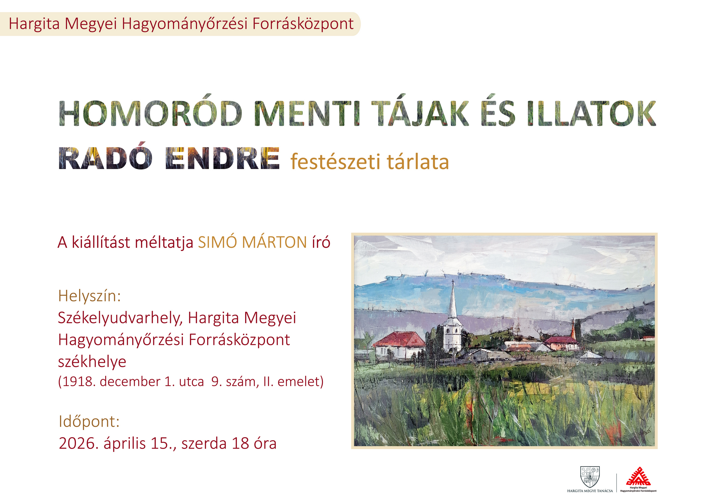 Homoród menti tájak és illatok címmel nyitják meg az etédi születésű, Recsenyéden élő Radó Endre alkotó festészeti tárlatát szerdán 17 órától Székelyudvarhelyen, a Hargita Megyei Hagyományőrzési Forrásközpont székhelyén (1918. december 1. utca 9. szám, II. emelet). A tárlat tájképeket és csendéleteket vonultat fel, az utóbbi időszak terméséből válogatva. A kiállításon szereplő olaj- és akrilképeket a Homoród menti környezet ihlette. A tárlatot Simó Márton író méltatja.