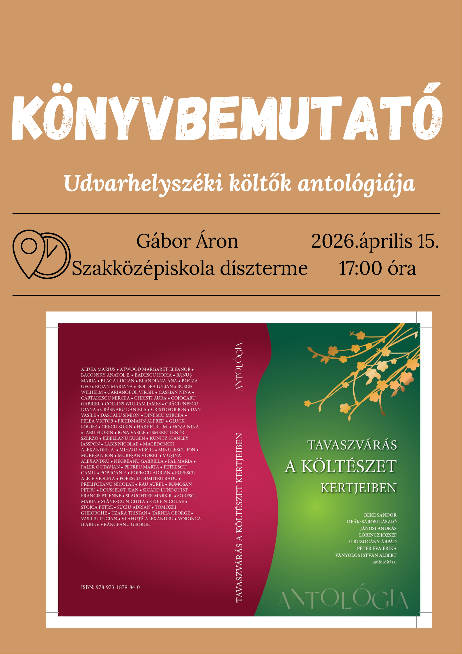 Udvarhelyszéki költők műfordításait tartalmazó, Tavaszvárás a költészet kertjében című antológiakötetet mutatják be szerdán 17 órától a szentegyházi Gábor Áron Szakközépiskola dísztermében. Az eseményen kiderül, hogyan szólalnak meg más népek szerzői a mi alkotóink tolmácsolásában, a meghívottak Jánosi András, Lőrincz József, P. Buzogány Árpád, Péter Éva Erika és Ványolos István Albert írók, költők lesznek. Az est házigazdája Finta Erika könyvtáros, aki a fordítókat faggatja majd. Az udvarhelyszéki alkotók versfordításait tartalmazó kötet az Udvarhelyszék Kulturális Egyesület kiadásában jelent meg a fordítók költségén, a témák szerint csoportosított fordításokat az angol, francia, ír, német, román nyelven verselők kislexikona, valamint a fordítók rövid életrajza egészíti ki.