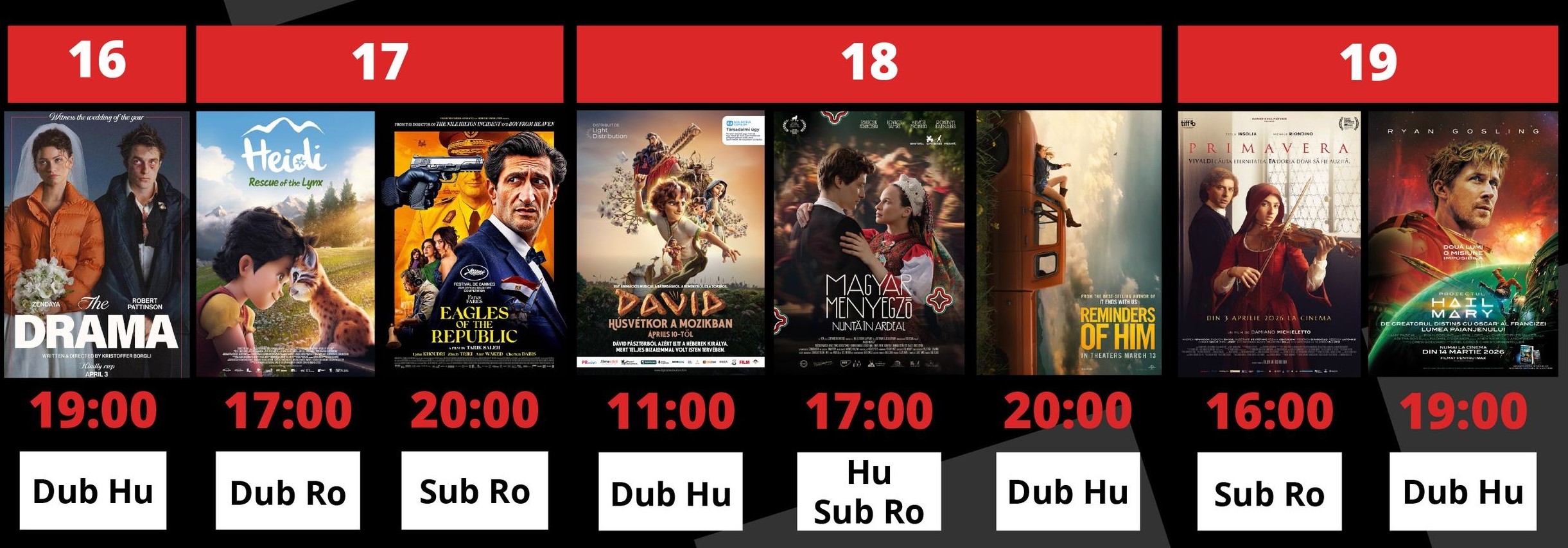 Csütörtökön 19 órától a Kész dráma című vígjátékot vetítik magyar szinkronnal, pénteken 17 órától a Heidi – Rescue of the Lynx animációt láthatjuk román szinkronnal, 20-tól pedig az Eagles of the Republic című egyiptomi–svéd–francia politikai thriller és neo-noirt tűzik műsorra eredeti nyelven, román felirattal. Szombaton 11-től a Dávid című animációt tekinthetjük meg magyar szinkronnal, 17-től a Magyar menyegző című zenés táncfilmet tűzik műsorra eredeti nyelven, román felirattal, 20-tól pedig az Emlékek róla című drámát vetítik magyar hanggal. Vasárnap 16 órától a Primavera című drámát vetítik olasz (eredeti) nyelven, román felirattal, 19-től pedig A Hail Mary-küldetés című sci-fit vetítik magyar szinkronnal. A vetítésekre jegyek válthatók a prokult.ro honlapon.