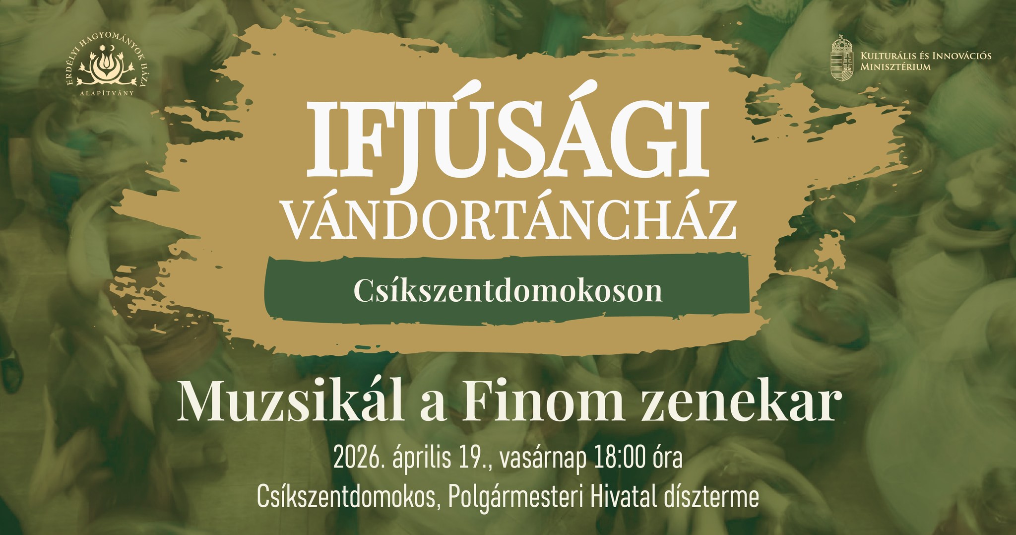 Ifjúsági táncházba várja a fiatalokat vasárnap 18 órától a csíkszentdomokosi polgármesteri hivatal dísztermébe az Erdélyi Hagyományok Háza Alapítvány csapata. Az eseményen ördöngösfüzesi táncokat oktat Fülöp Csaba és Mátéfi Ágota, muzsikál a Finom zenekar.