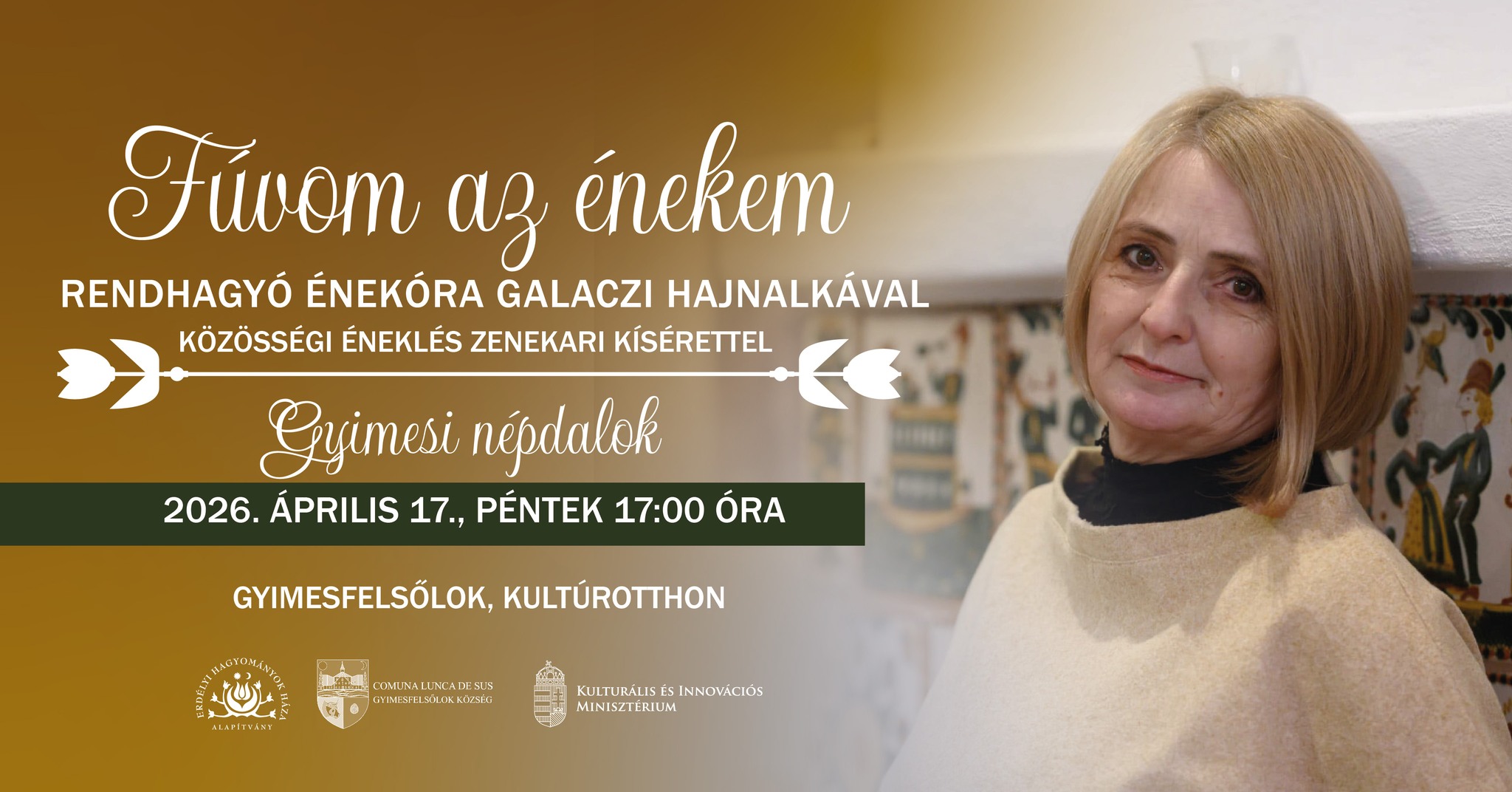 Fúvom az énekem címmel szervez rendhagyó énekórát zenekari kísérettel a gyimesfelsőloki kultúrotthonban pénteken 17 órától az Erdélyi Hagyományok Háza Alapítvány csíkszeredai területi irodája. Az eseményen Galaczi Hajnalkától tanulhatnak gyimesi népdalokat az érdeklődők, a zenei kíséretet Pál Csilla, Bodor Tibor és Molnár Szabolcs adják.