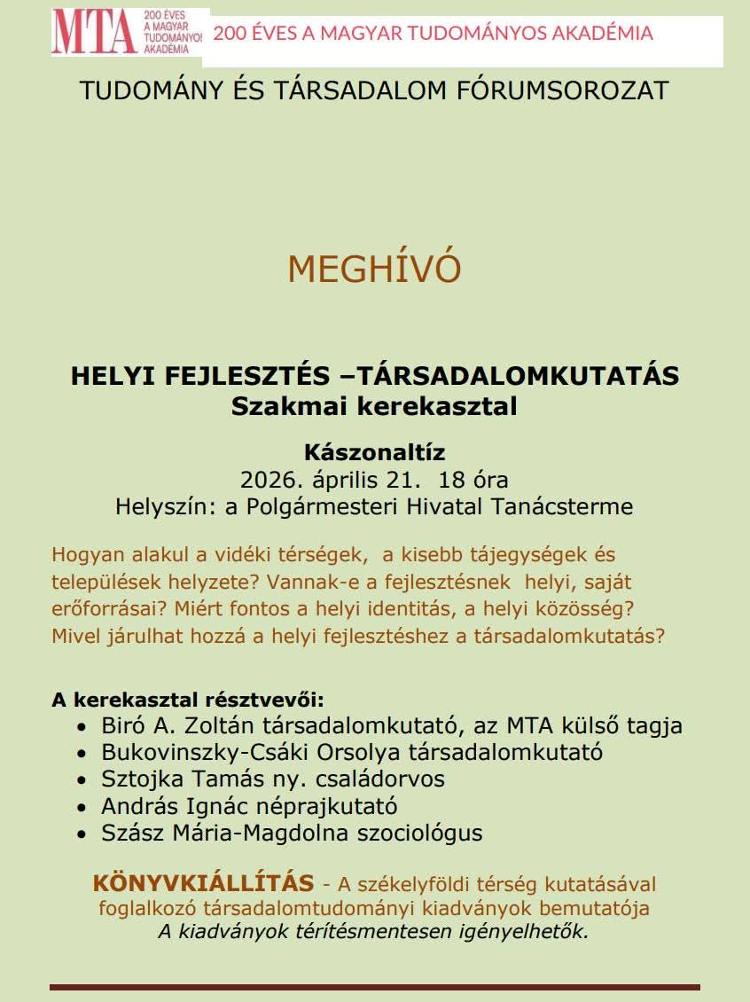 Helyi fejlesztés – társadalomkutatás címmel szerveznek szakmai kerekasztal-beszélgetést kedden 18 órától a kászonaltízi polgármesteri hivatal tanácstermében. Az eseményen szó lesz arról, hogy hogyan alakul a vidéki térségek, a kisebb tájegységek és települések helyzete, vannak-e a fejlesztésnek helyi, saját erőforrásai, miért fontos a helyi identitás, a helyi közösség, és mivel járulhat hozzá a helyi fejlesztéshez a társadalomkutatás. A kerekasztal résztvevői Biró A. Zoltán társadalomkutató, az MTA külső tagja, Bukovinszky-Csáki Orsolya társadalomkutató, Sztojka Tamás nyugalmazott családorvos, András Ignác néprajkutató és Szász Mária-Magdolna szociológus lesznek. Az est során a székelyföldi térség kutatásával foglalkozó társadalomtudományi kiadványokat is bemutatják, amelyek térítésmentesen igényelhetők.