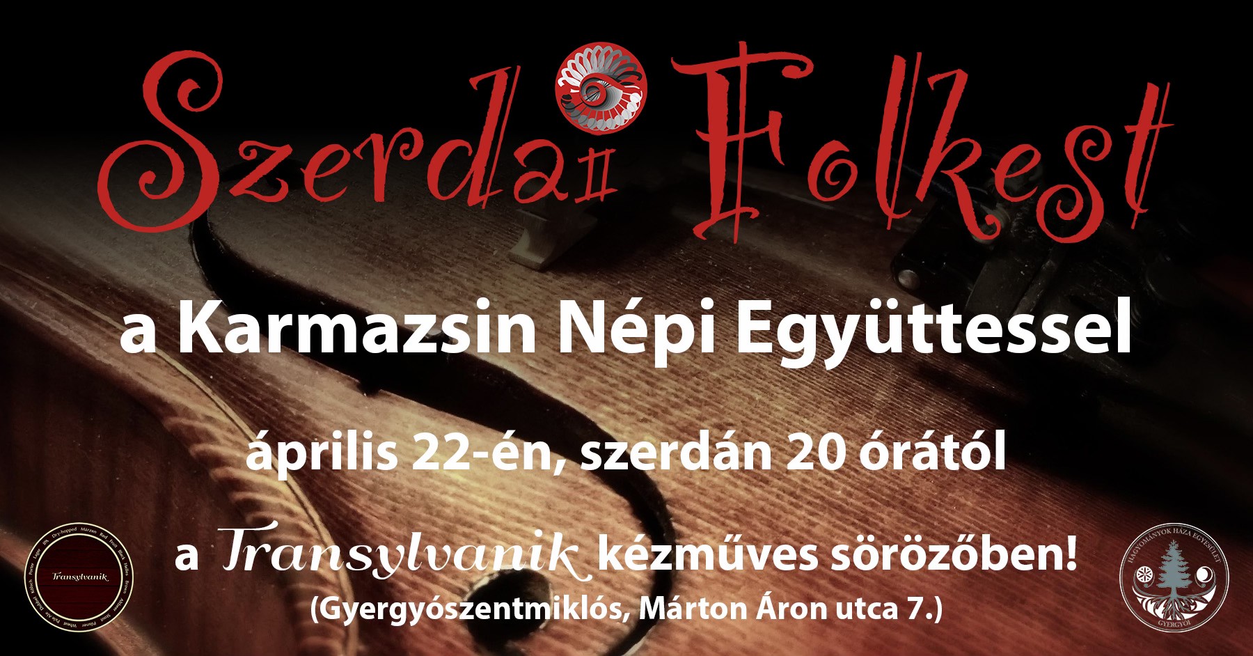 Folkestet tart kéthetente szerdánként a Karmazsin Népi Együttes a gyergyószentmiklósi Transylvanik kézművessörözőben (Márton Áron utca 7. szám), a következő alkalom e hét szerdáján, 20 órától lesz. A belépés ingyenes. A Karmazsin Népi Együttes 2015-ben alakult, tagjai a Gyergyói-medencében tevékenykedő népzenészek és énekesek. Az együttes elsődleges célja a helyi autentikus népzene vagy népi énekek kutatása, gyűjtése, visszatanulása, illetve ezek színpadra való alkalmazása tematikus előadások formájában és oktatása táncházakban vagy oktatói munkákban.