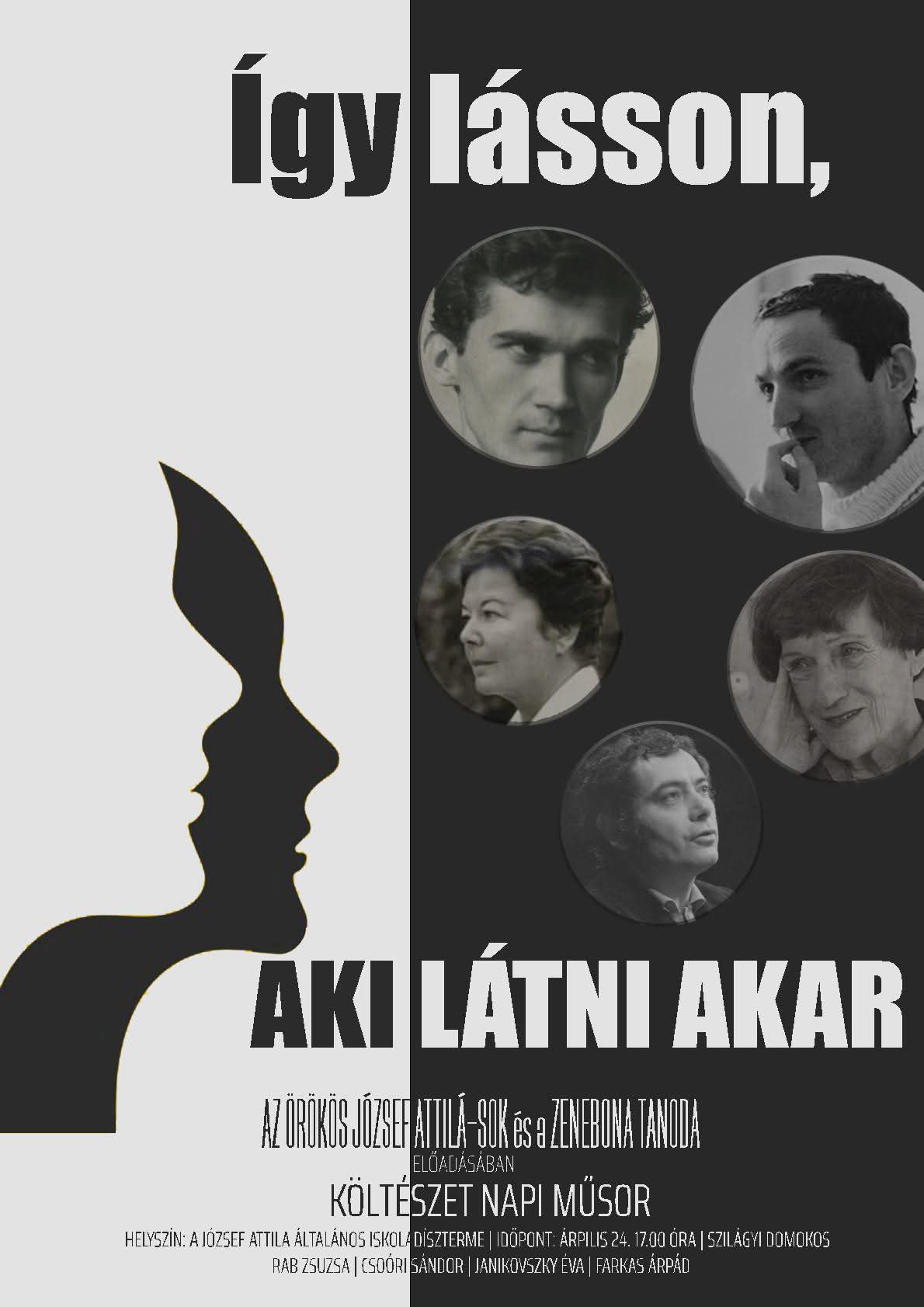 Így lásson, aki látni akar címmel mutatnak be költészetnapi műsort az Örökös József Attilá-sok csapata és a Zenebona Tanoda tagjai a csíkszeredai József Attila Általános Iskola dísztermében pénteken 17 órától. Az eseményen Szilágyi Domokos, Rab Zsuzsa, Csoóri Sándor, Janikovszky Éva és Farkas Árpád művei csendülnek fel.
