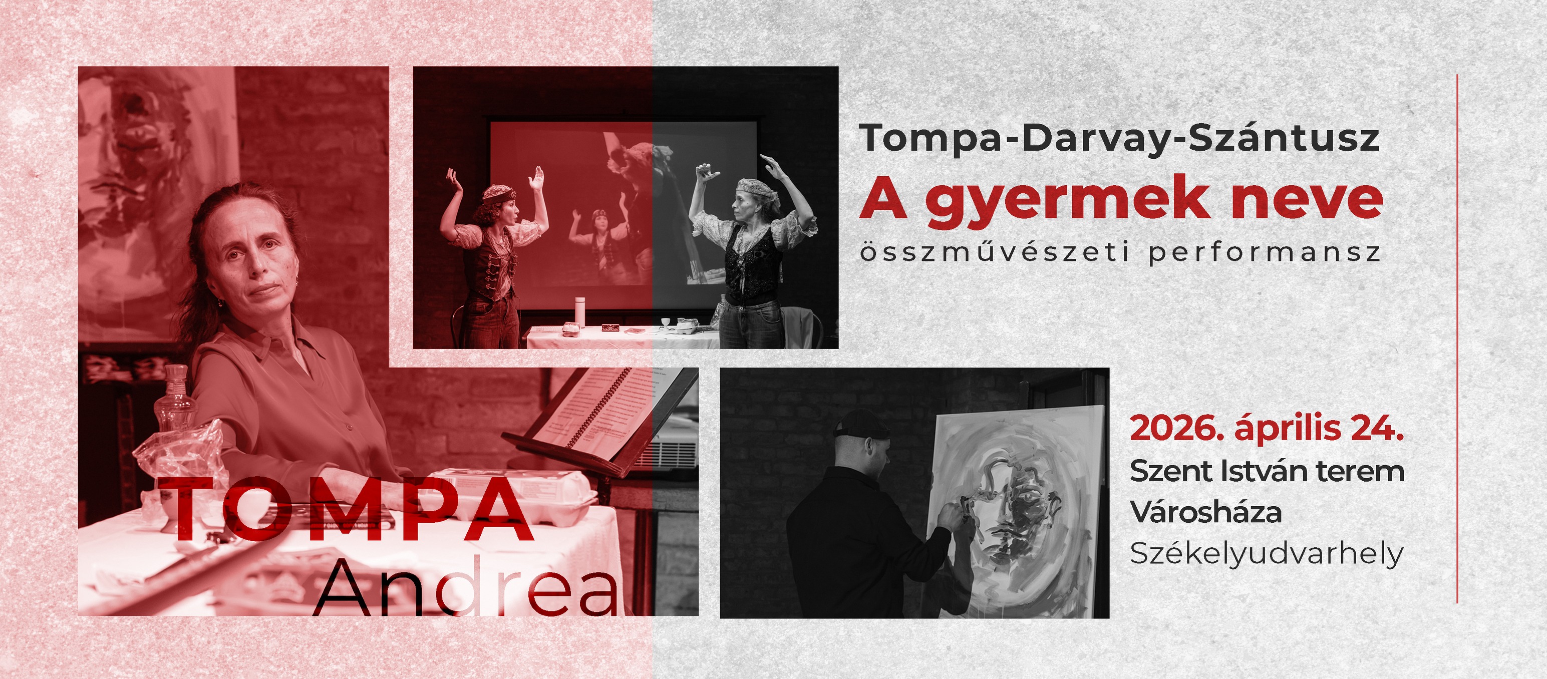 A gyermek neve címmel tartanak összművészeti performanszt pénteken 18 órától a székelyudvarhelyi városháza Szent István termében, amit író-olvasó találkozó követ. Az előadáson Tompa Andrea – akit elsősorban íróként és egyetemi oktatóként ismerünk – performeri minőségben is jelen lesz egykori kolozsvári tanítványaival, Darvay Botond látványtervezővel és Szántusz Noémi színésznővel közösen mutatnak be részleteket a regényeiből, illetve az alkalomra írt szövegeit és biográfiáját. Az előadásban olyan témák merülnek fel, mint a magyar nyelvű iskolák bezárása a román rendszerváltás előtt, abortusztörvény, a szülőváros jelentősége és sok más. 19.30-tól beszélgetés lesz Tompa Andreával.