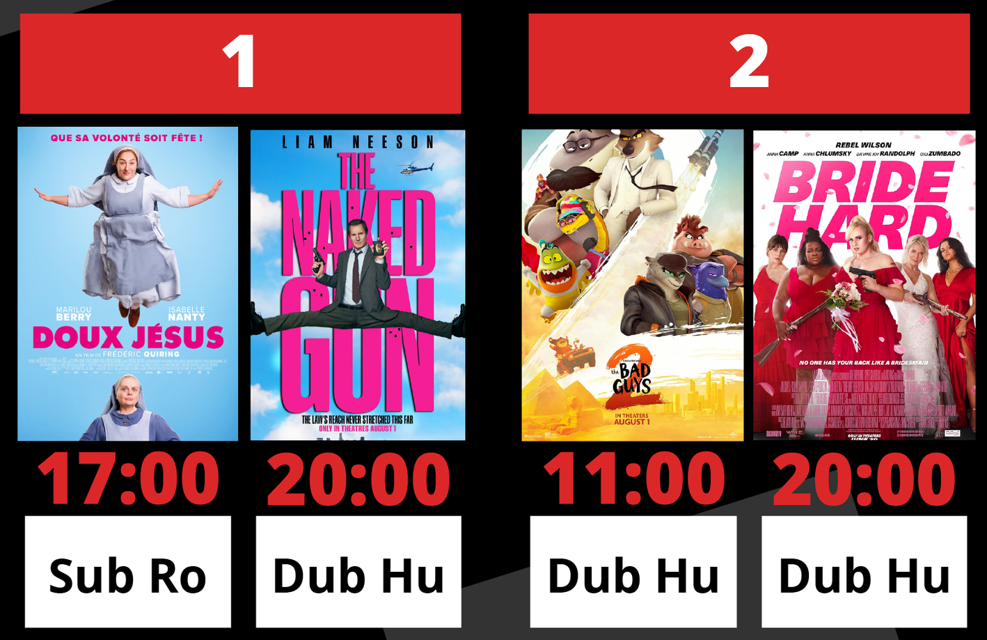 Pénteken 17 órától vetítik Az apáca (The Nun in The City) című vígjátékot francia (eredeti) nyelven, román felirattal, 20 órától pedig a Csupasz pisztoly lesz látható magyar szinkronnal. Szombaton 11-től a Rosszfiúk 2 című animációs kalandfilmet tűzik műsorra magyar hanggal, 20 órától pedig a Násznaposokat nézhetik meg magyar szinkronhanggal. A vetítésekre jegyek válthatók a bilete.ro honlapon.