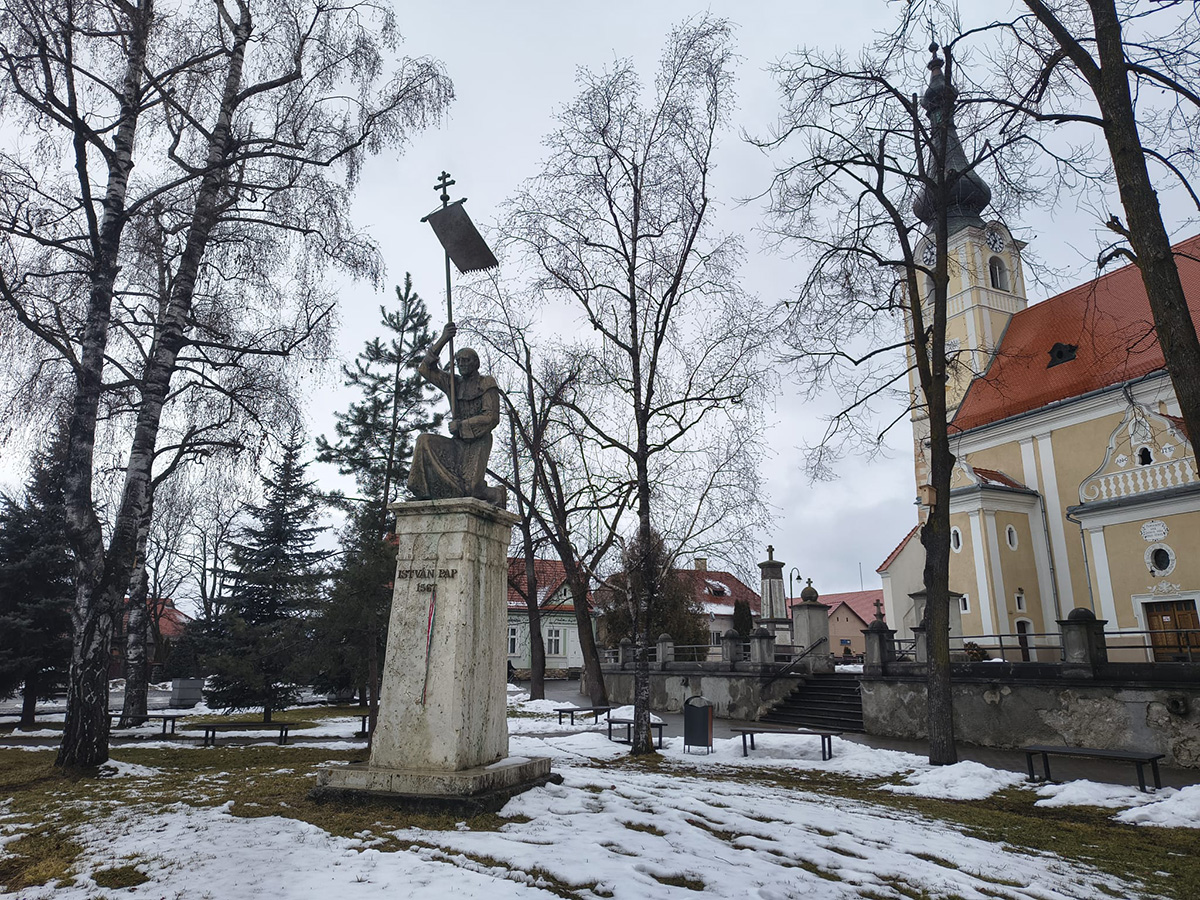 A gyergyóalfalvi római katolikus templom szomszédságában áll István pap szobra, Kiss Levente helybéli származású szobrászművész munkája. Az István paphoz kapcsolódó legenda közismert: az unitárius felekezetű János Zsigmond fejedelem idejében Erdélyben egyre elterjedtebbé vált a protestantizmus, ám a gyergyói, csíki és kászoni székelyek ragaszkodtak katolikus hitükhöz. A gyergyóiak 1567-ben István pap vezetésével mentek hitvédő csíksomlyói zarándoklatra, amikor hírét vették János Zsigmond Székelyudvarhely felől érkező seregének. A történet szerint, amíg a csíki, gyergyói és kászoni katolikusok a Tolvajos-tetőn győztes ütközetet vívtak a fejedelem katonáival, addig az asszonyok, gyermekek és idősek a csíksomlyói templomban imádkoztak a Szűzanyához. Bár mindez nem történelmi tény, a hitvédő István pap emlékét megőrizték az alfalviak, és a mai napig a csíksomlyói pünkösdi búcsús menetben a gyergyóalfalvi keresztalja halad a zarándoklat élén.