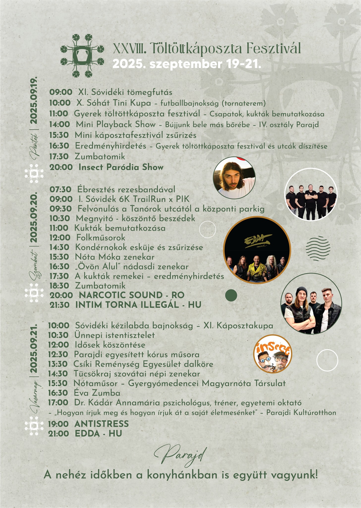 Parajdon szeptember 19–21. között huszonnyolcadik alkalommal rendezik meg a Töltöttkáposzta-fesztivált, amely a hagyományos ételek mellett változatos szórakozási lehetőségeket kínál. A program részletei a fesztivál hivatalos oldalán érhetők el, a település turisztikai kínálatába pedig a Visit Harghita eseménynaptára ad betekintést.