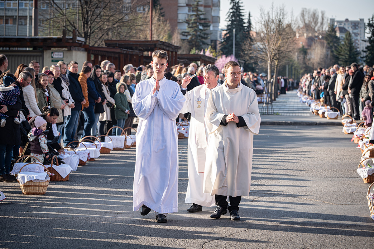 – Csíkszeredában nagyon szép hagyományos rendezvénnyé vált ez az ünnephez kapcsolódó szabadtéri ételszentelés. Ez a főtér, amely valamikor egészen más célzattal épült ki, immár több mint két évtizede ad helyet ennek az ünnepi eseménynek, mert annyira megsokasodtunk, hogy szükség van rá. Jól van ez így, hiszen keresztény feladataink közé tartozik a tanúságtétel is. Jelenlétünkkel, e szertartáson való részvételünkkel is hitünket akarjuk megvallani, tanúságot tenni a feltámadt Úr Jézus Krisztus mellett – mondta az egybegyűlt sok ezer embernek Tamás József püspök.